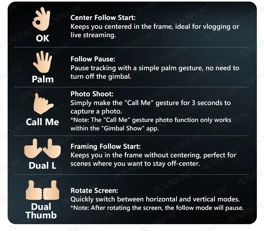 Note: The “Call Me” gesture photo function only works within the “Gimbal Show” app.