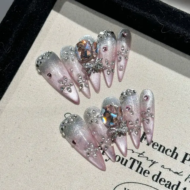24pcs Long Ballet French Press on Nails with Cute Pink Bow Shiny Diamond Decor False Nail Tips Wearable Sweet Korean Fake Nails