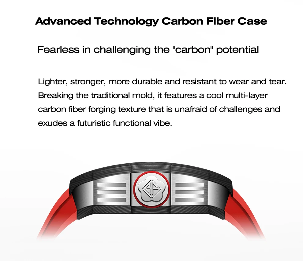 Lighter, stronger, more durable, and wear-resistant, this watch revolutionizes traditional watchmaking with its multi-layered carbon fiber forging and trendy texture, unleashing a futuristic functional feel.