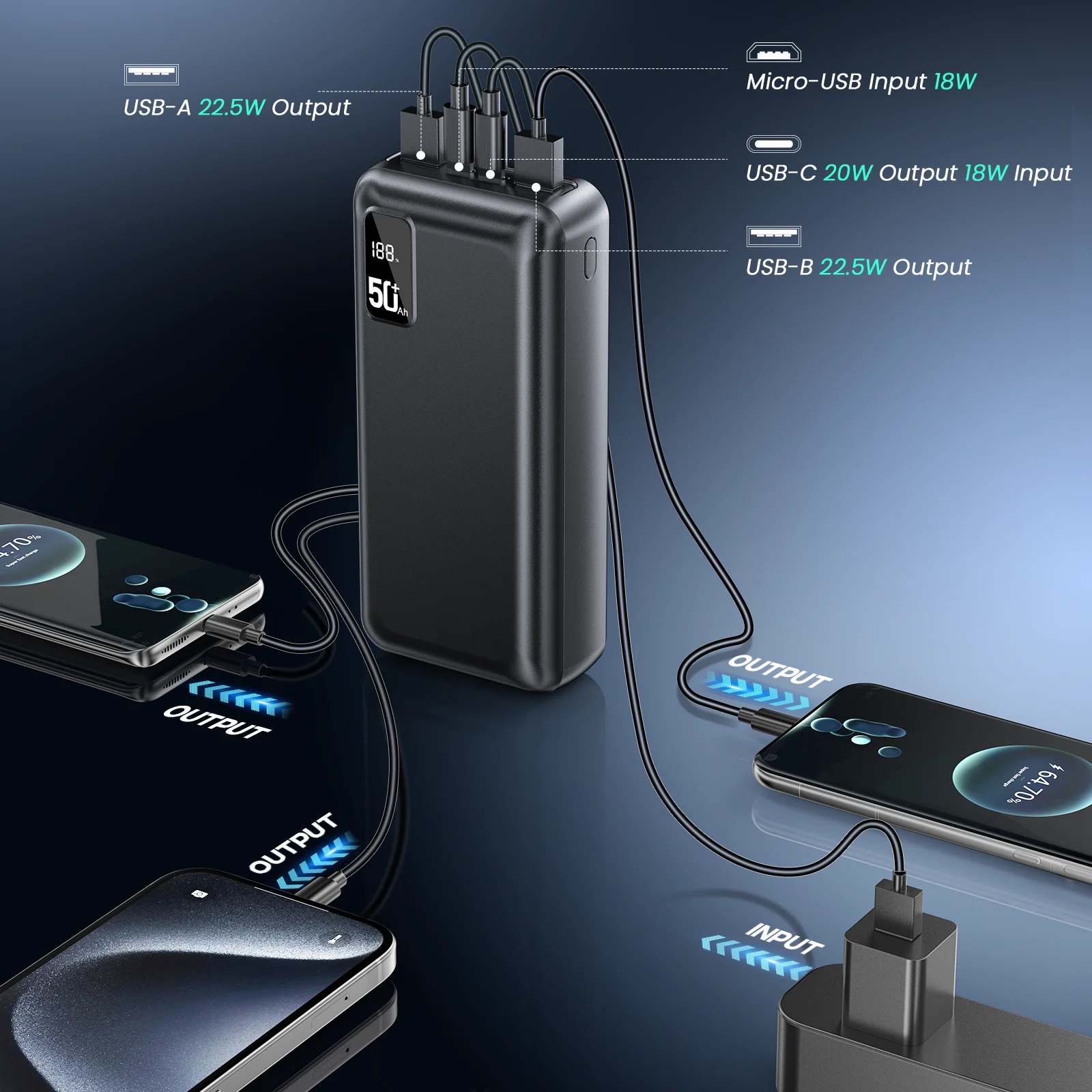With its impressive 50,000mAh capacity, it can recharge your smartphone 6-10 times, eliminating battery anxiety for extended trips,commutes, or daily use.