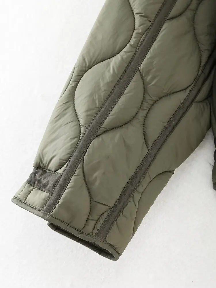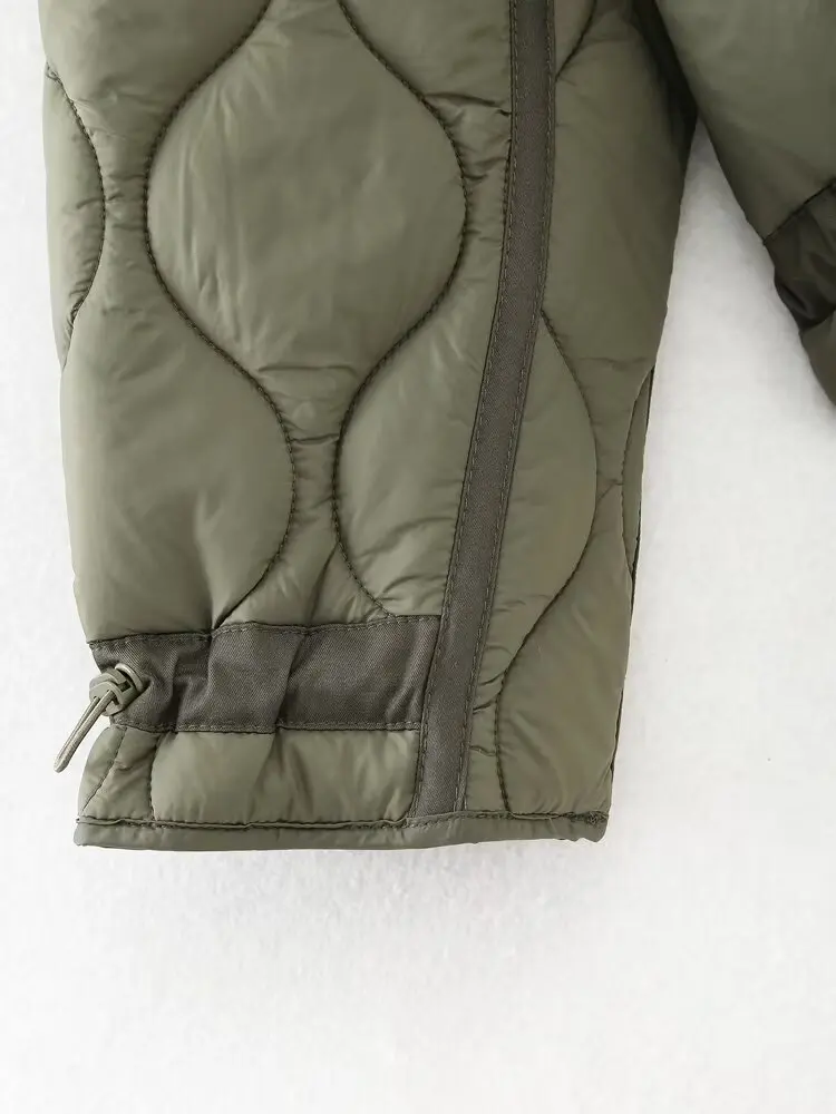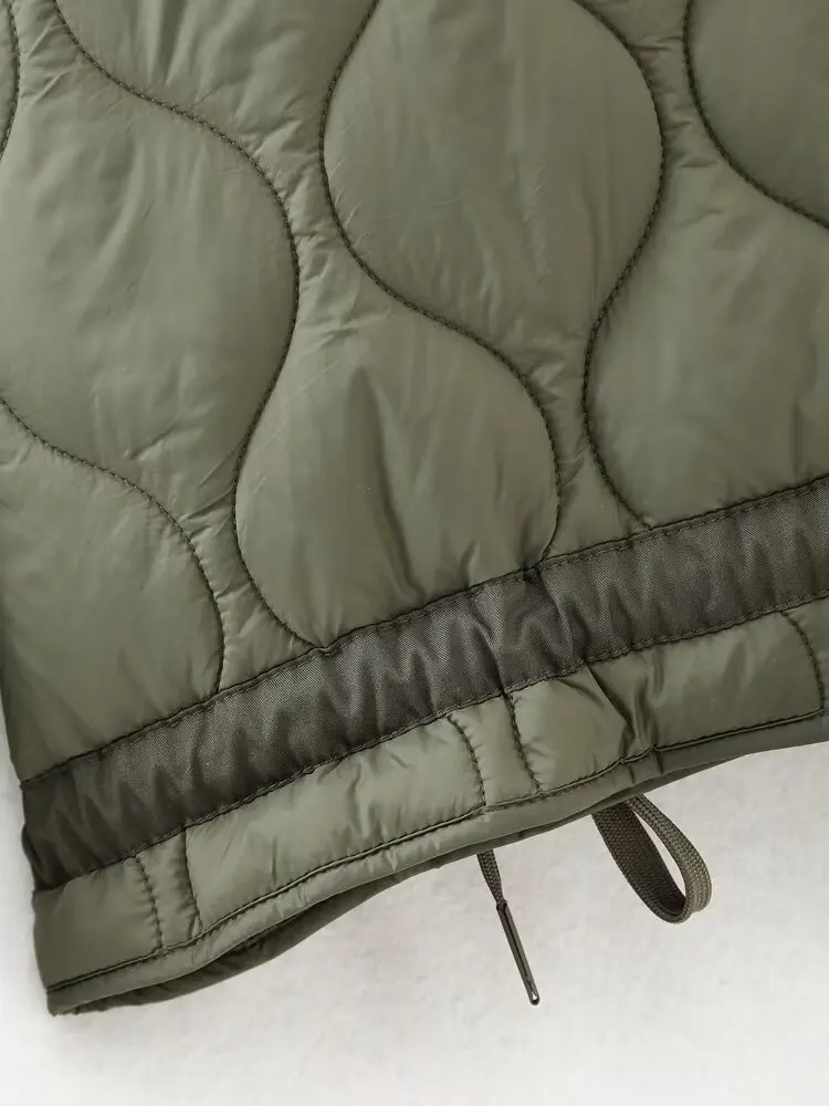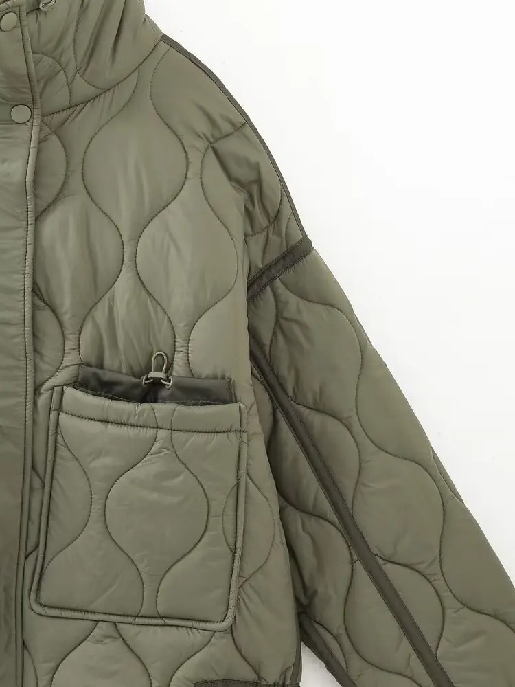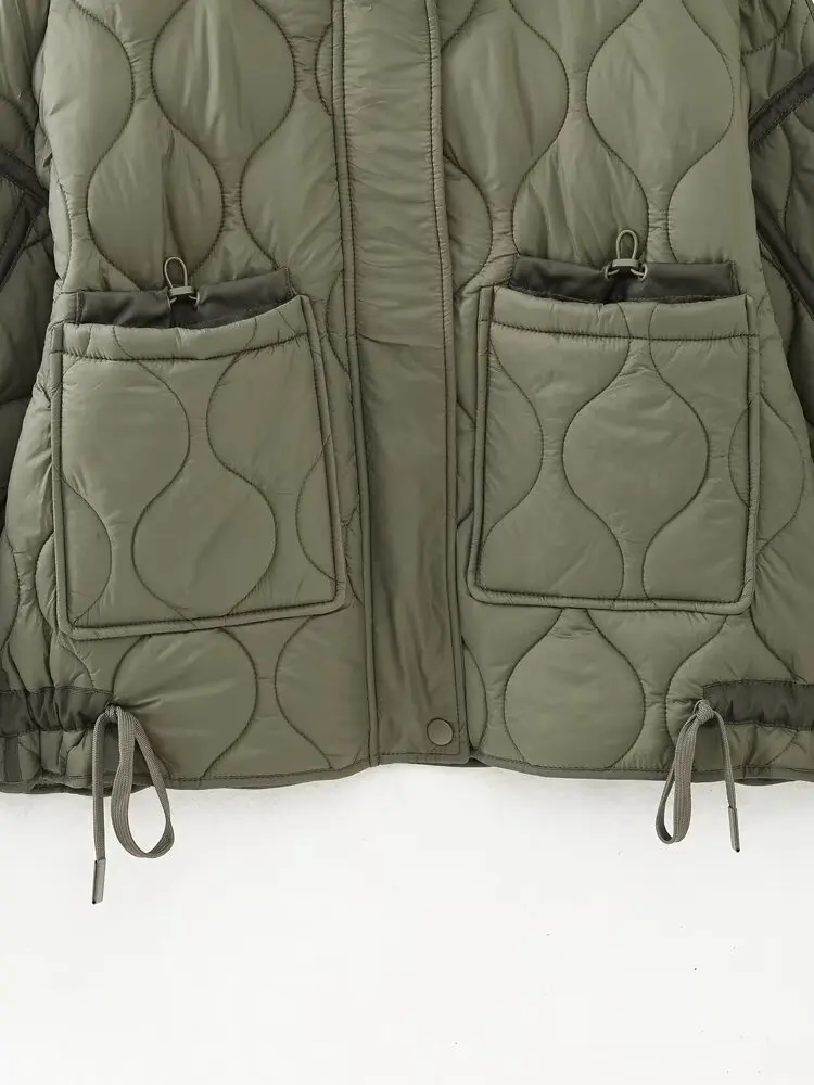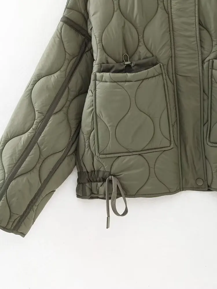 HH Women Vintage Solid Quilted Coat Stand Collar Long Sleeve Zipper Jacket Casual Drawstring Pocket Design