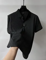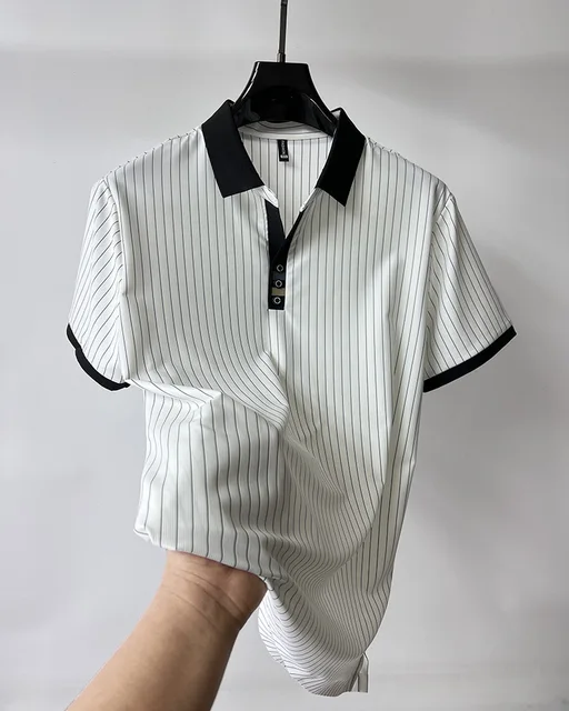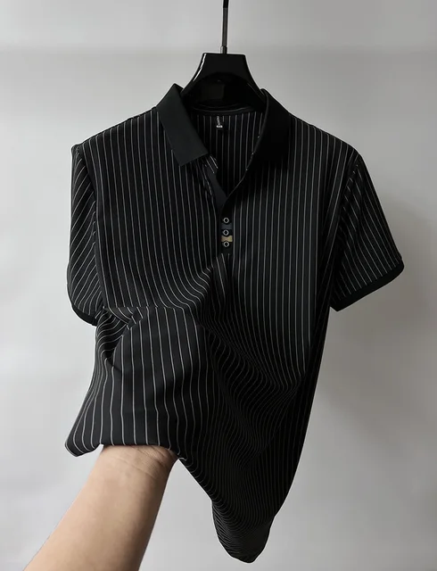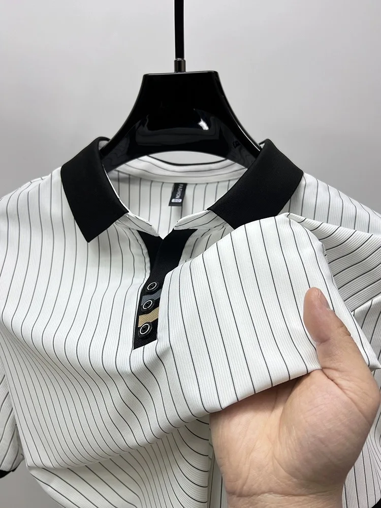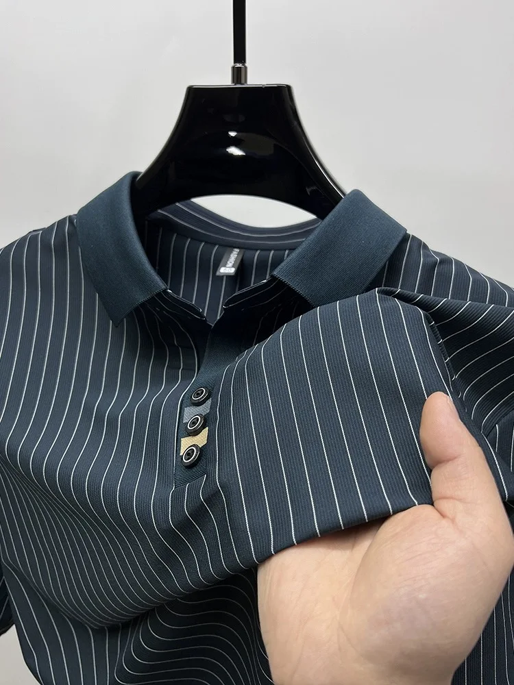 High end brand ice silk vertical stripe short sleeve POLO shirt men summer fashion business leisure T-shirt