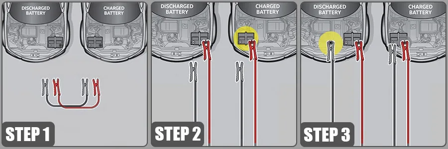 Connect the red clamps to the ”+” of the charged battery first and the other clamp to the ”+” of the discharged battery.
