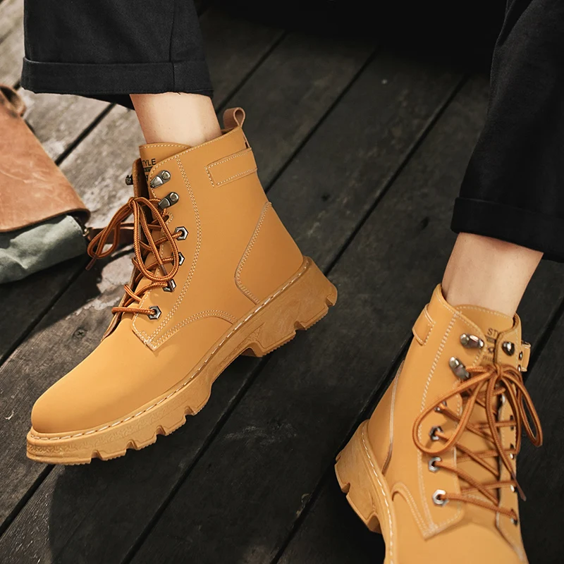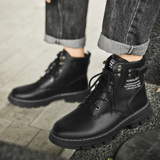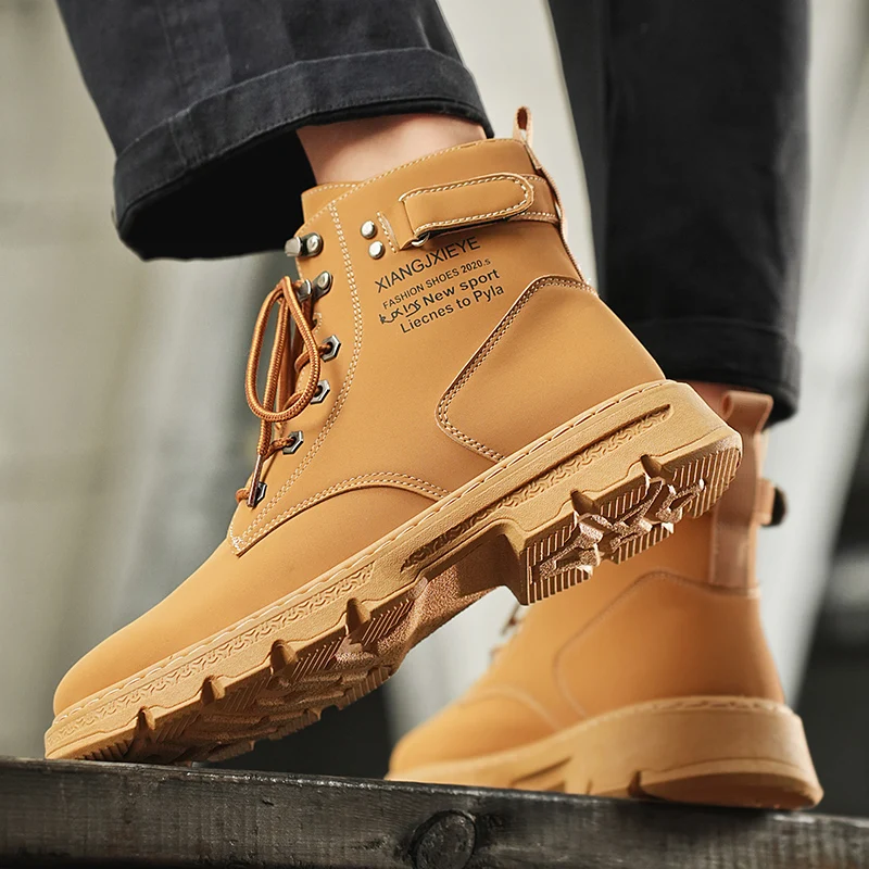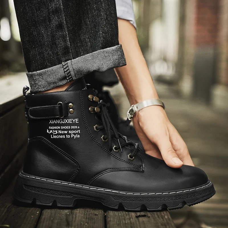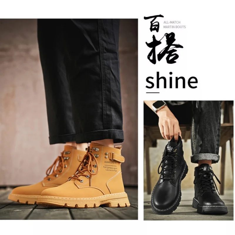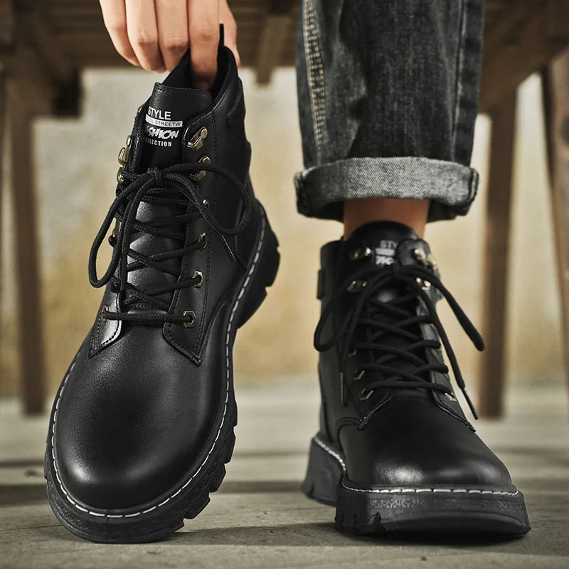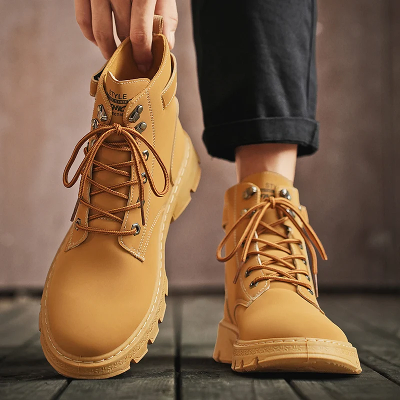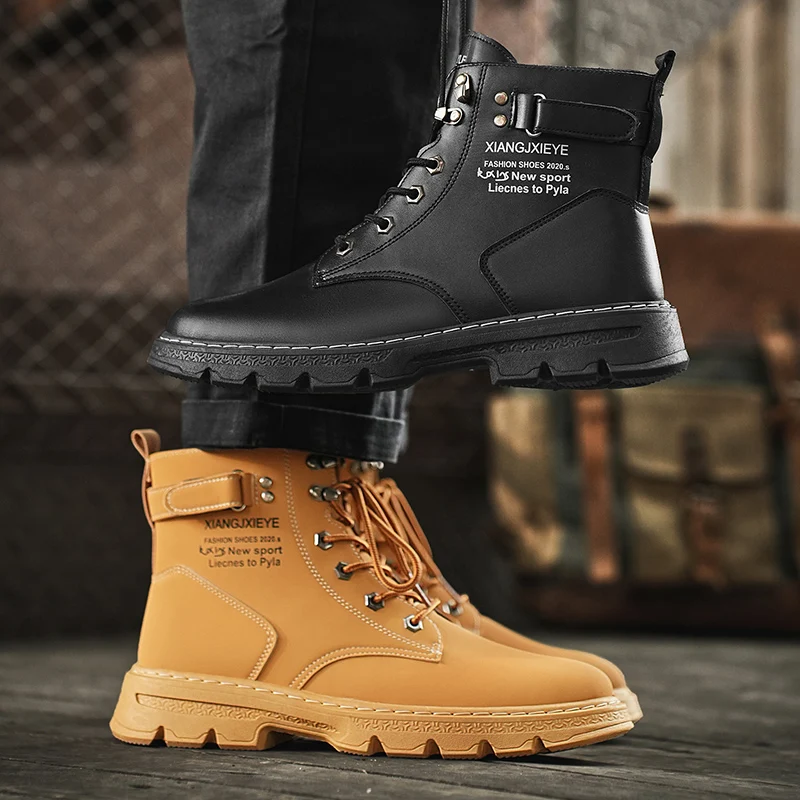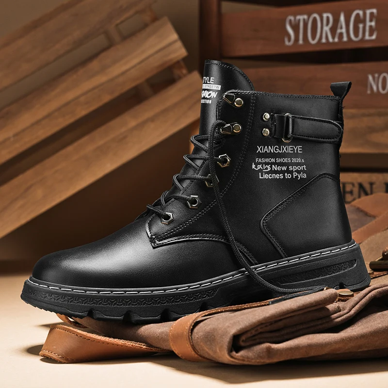 High Top Men Boots Leather Boots Winter Outdoor Casual Shoes Fashion Flat Work Boots Lace Up Non-Slip