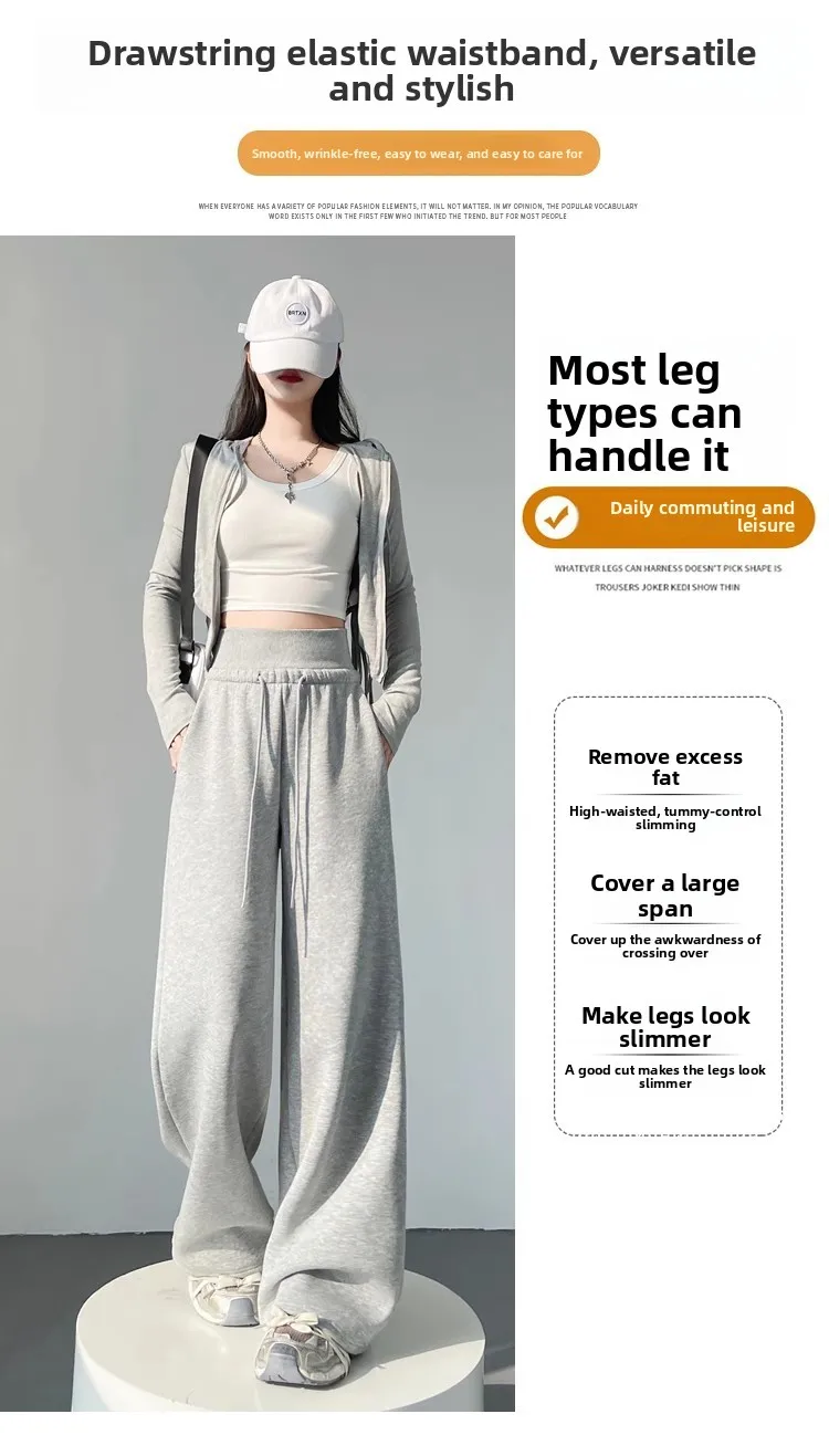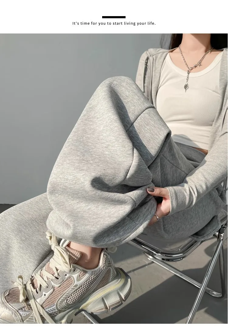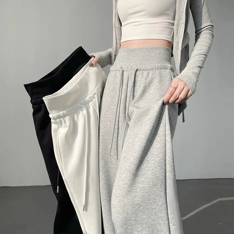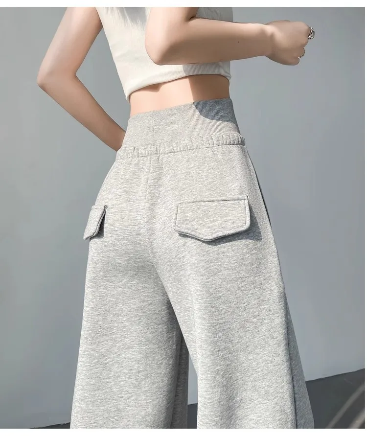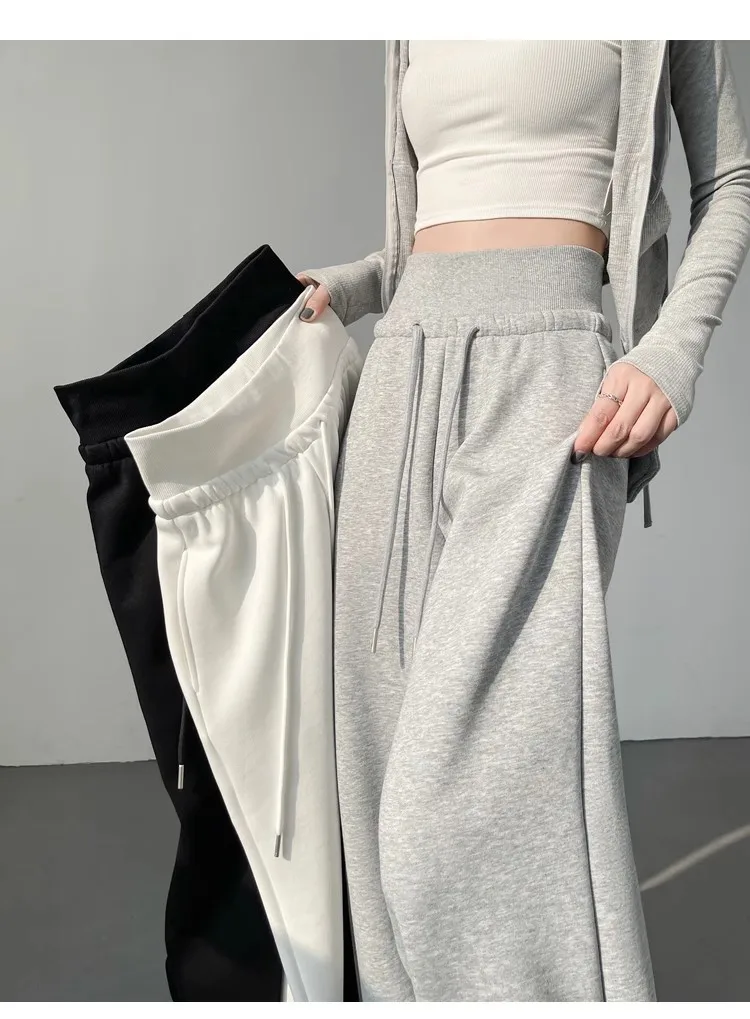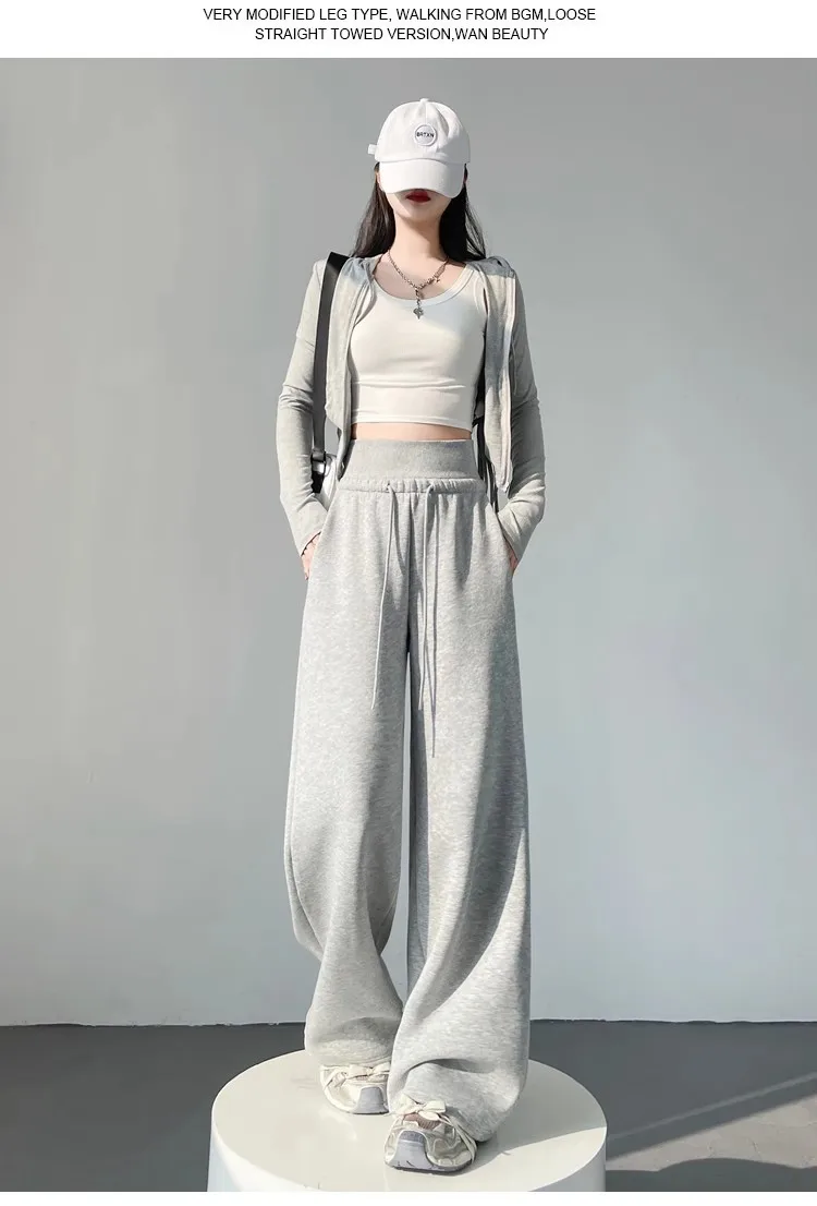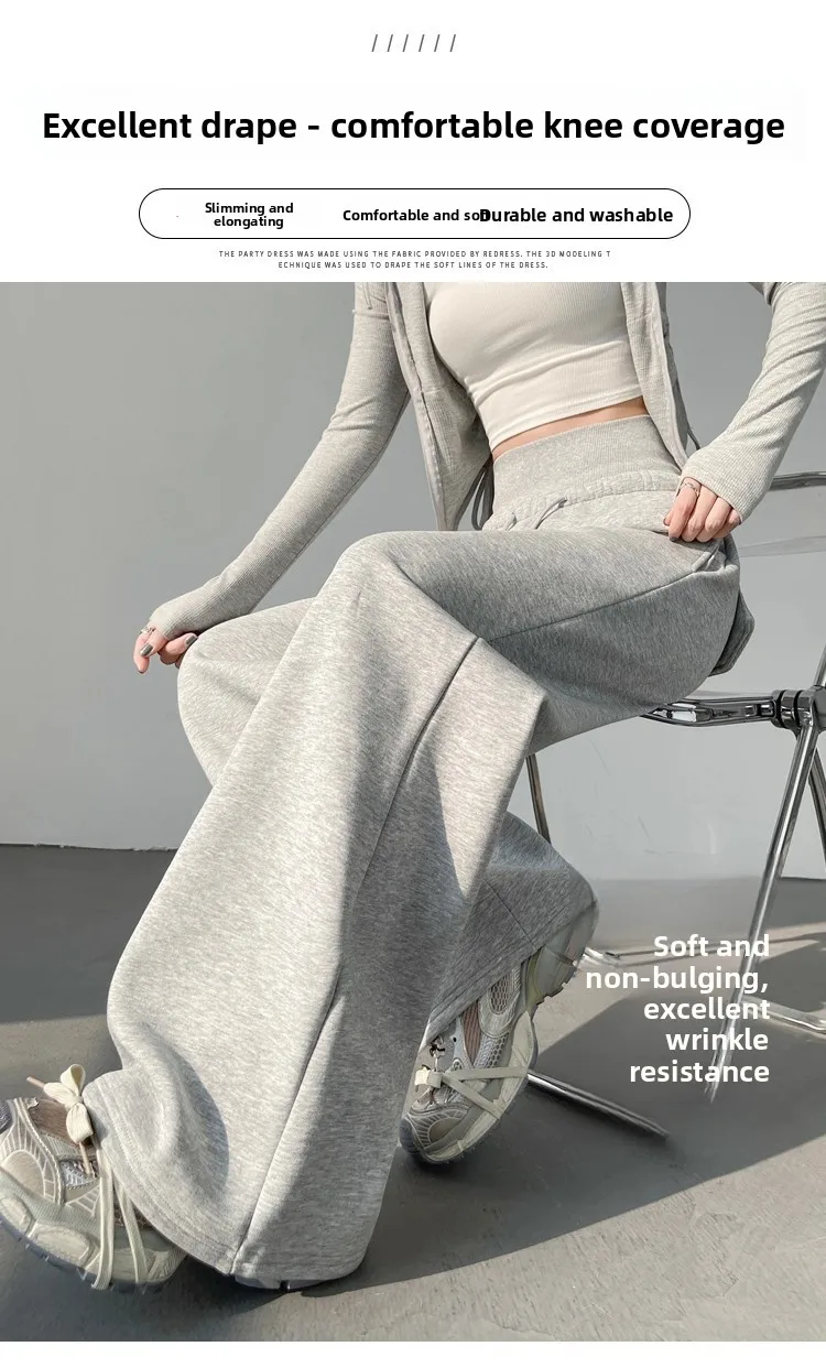 High Waist Grey American Style Sports Pants Women's Spring Autumn Tummy Control Casual Wide Leg Straight Loose Floor Length S...
