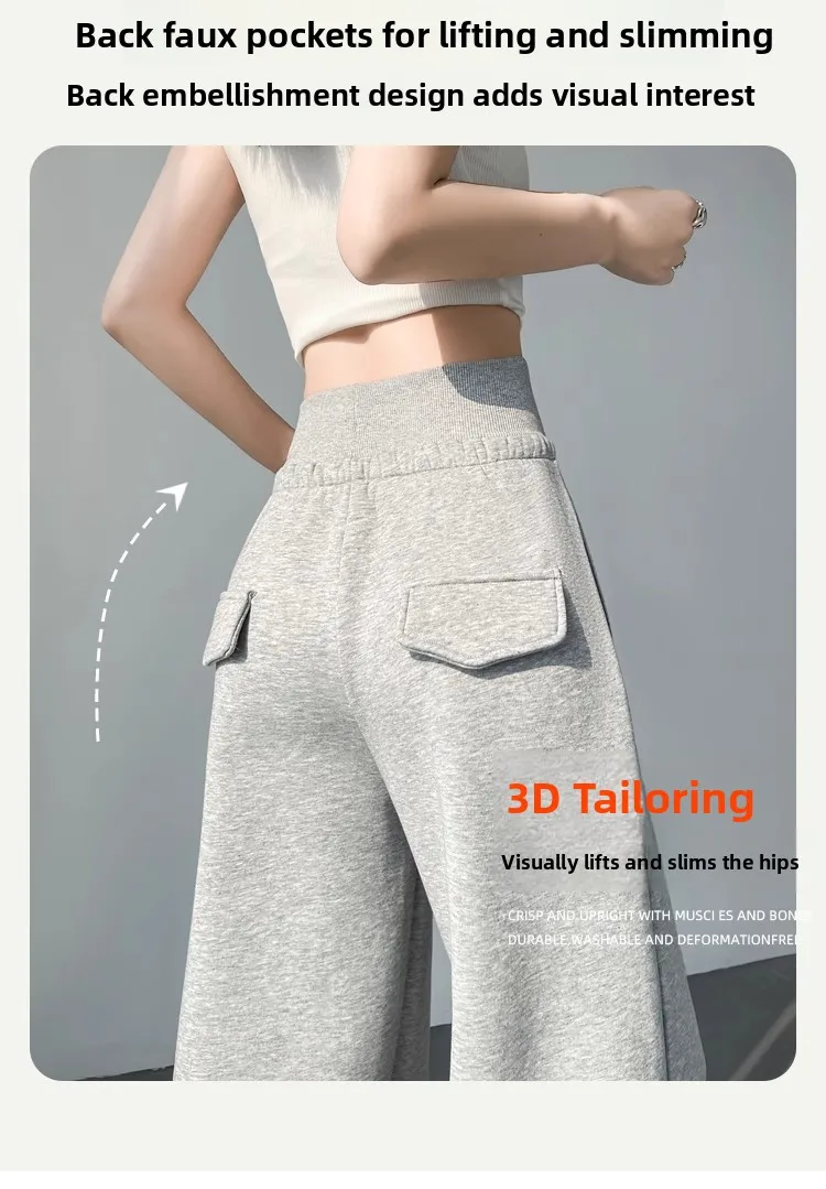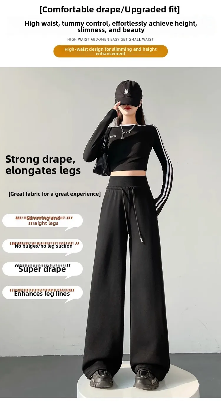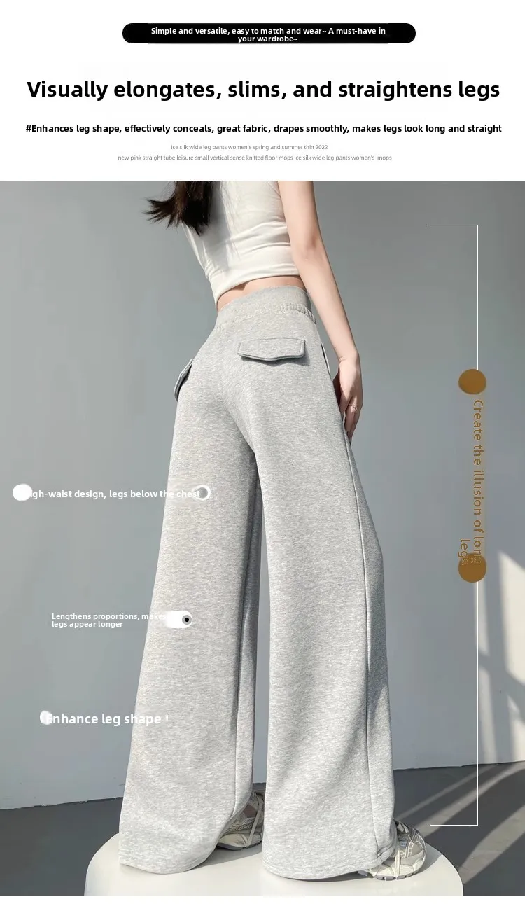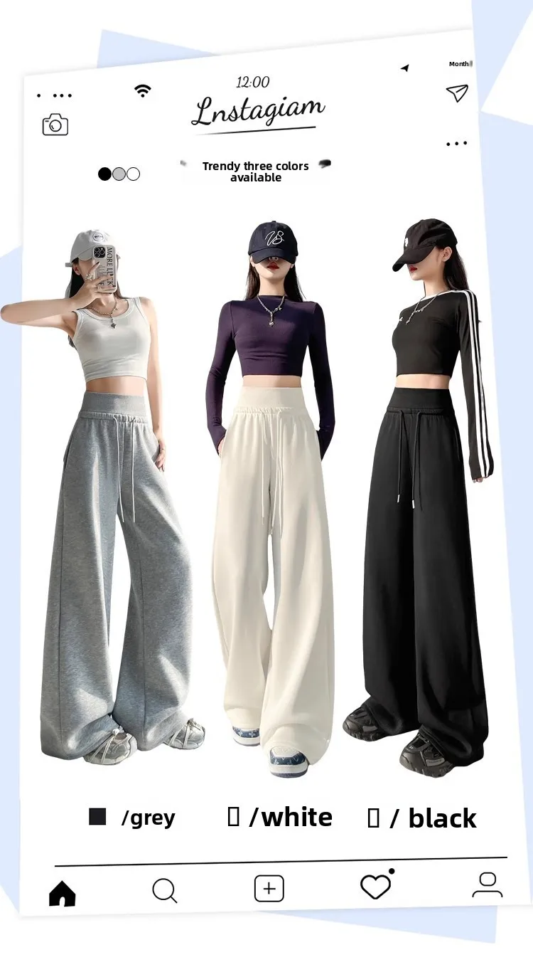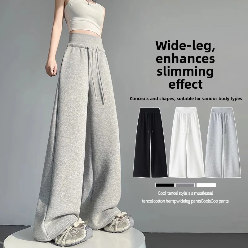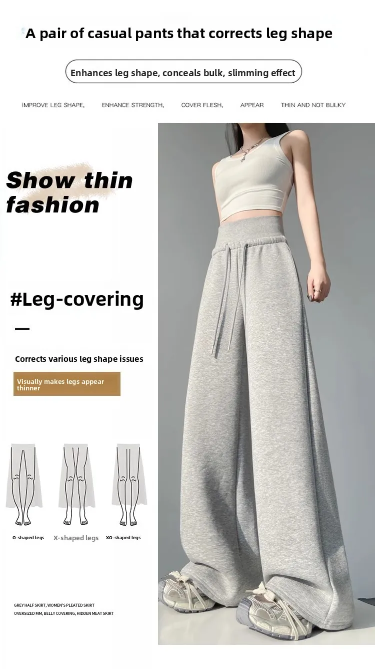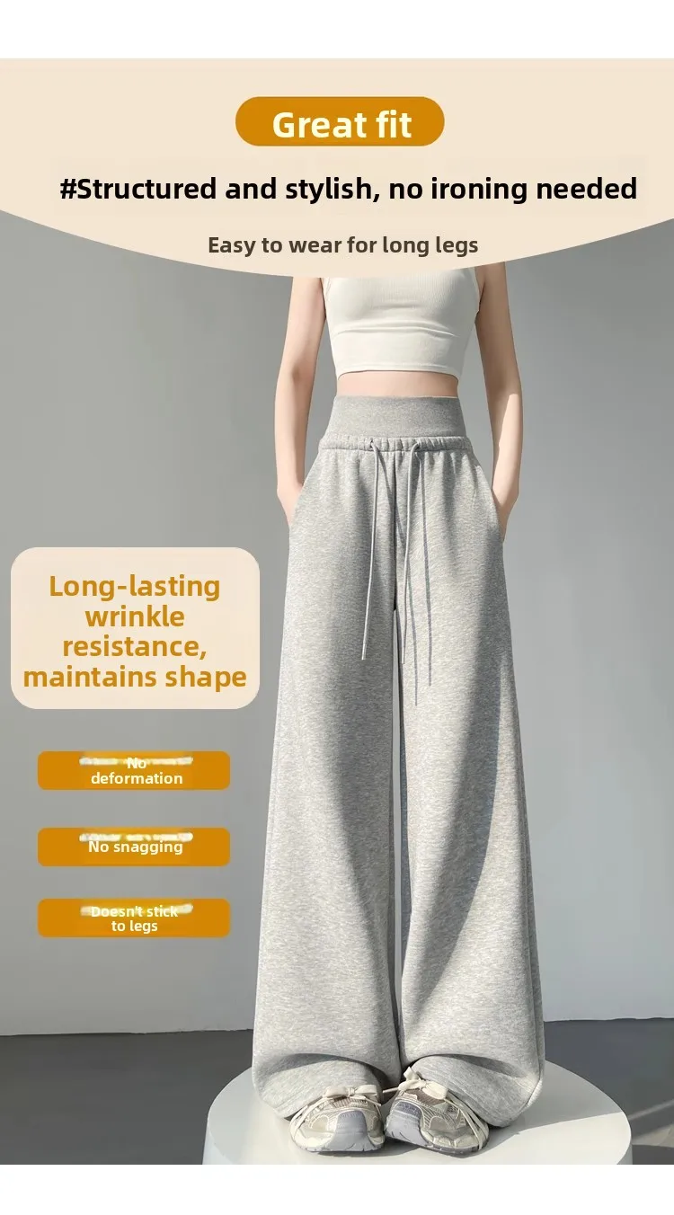 High Waist Grey American Style Sports Pants Women's Spring Autumn Tummy Control Casual Wide Leg Straight Loose Floor Length S...