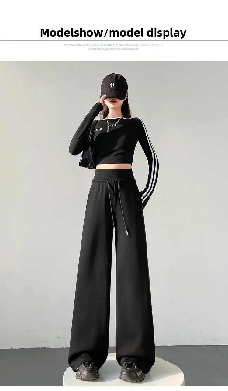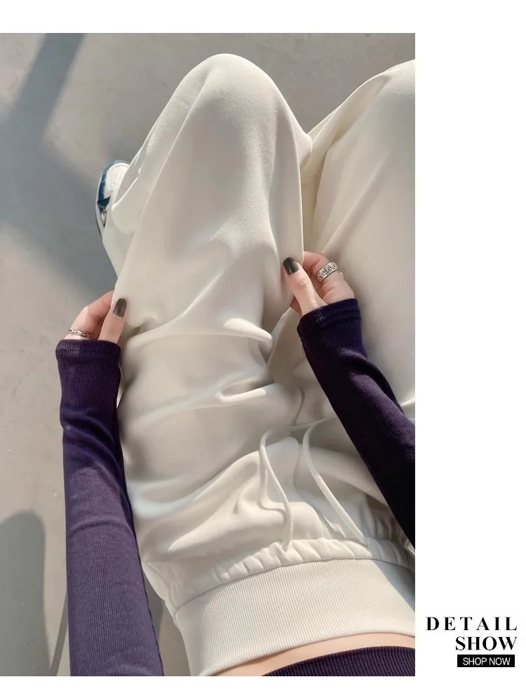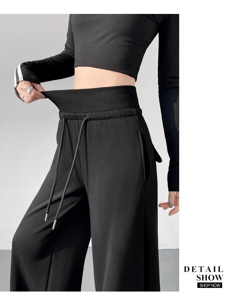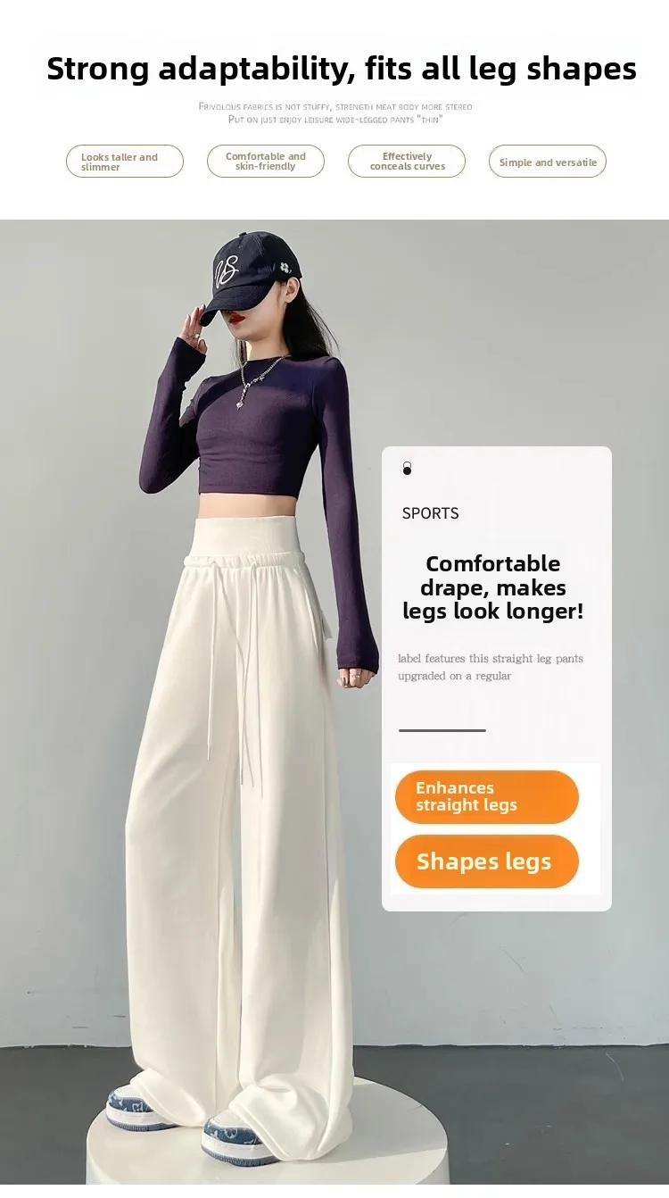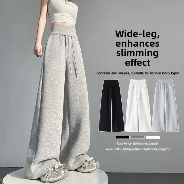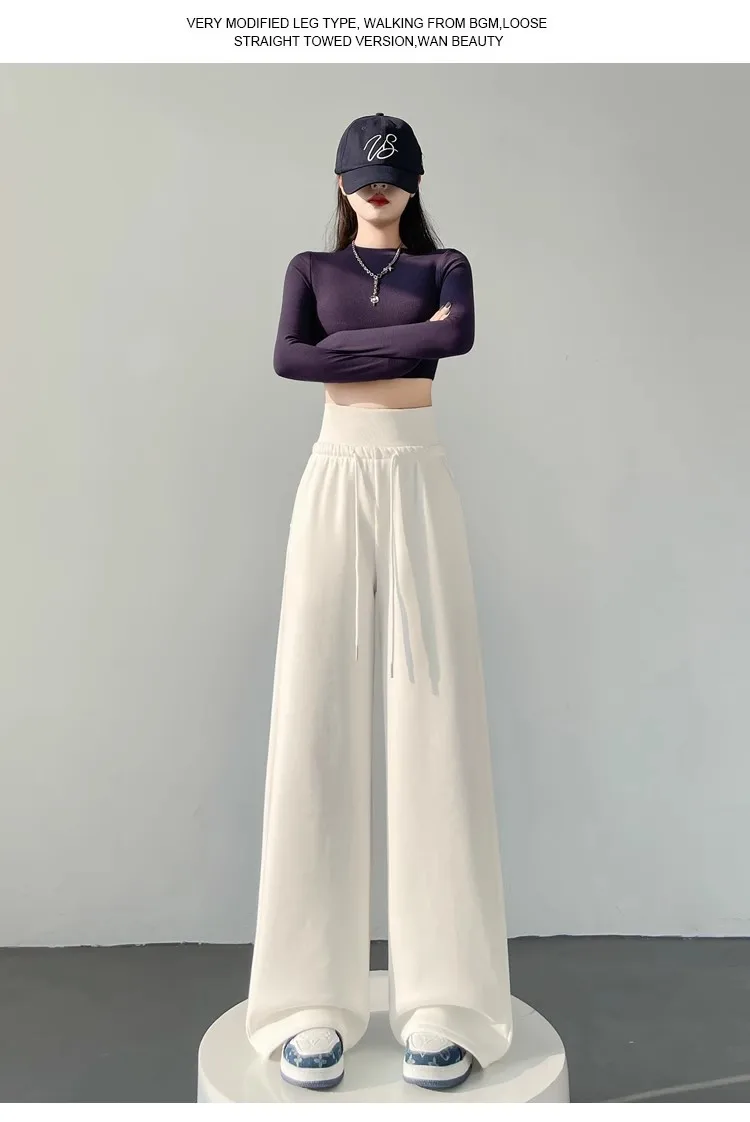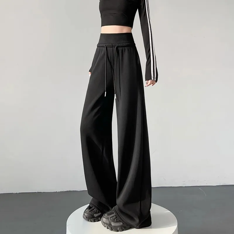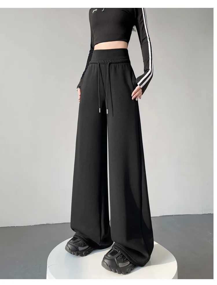High Waist Grey American Style Sports Pants Women's Spring Autumn Tummy Control Casual Wide Leg Straight Loose Floor Length S...