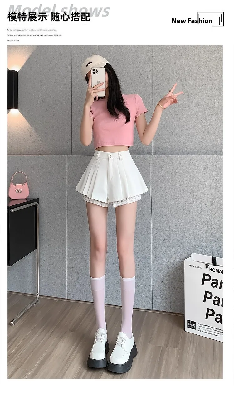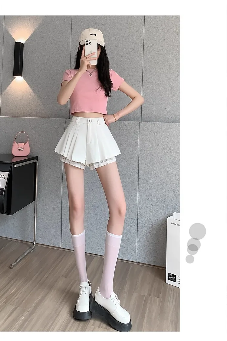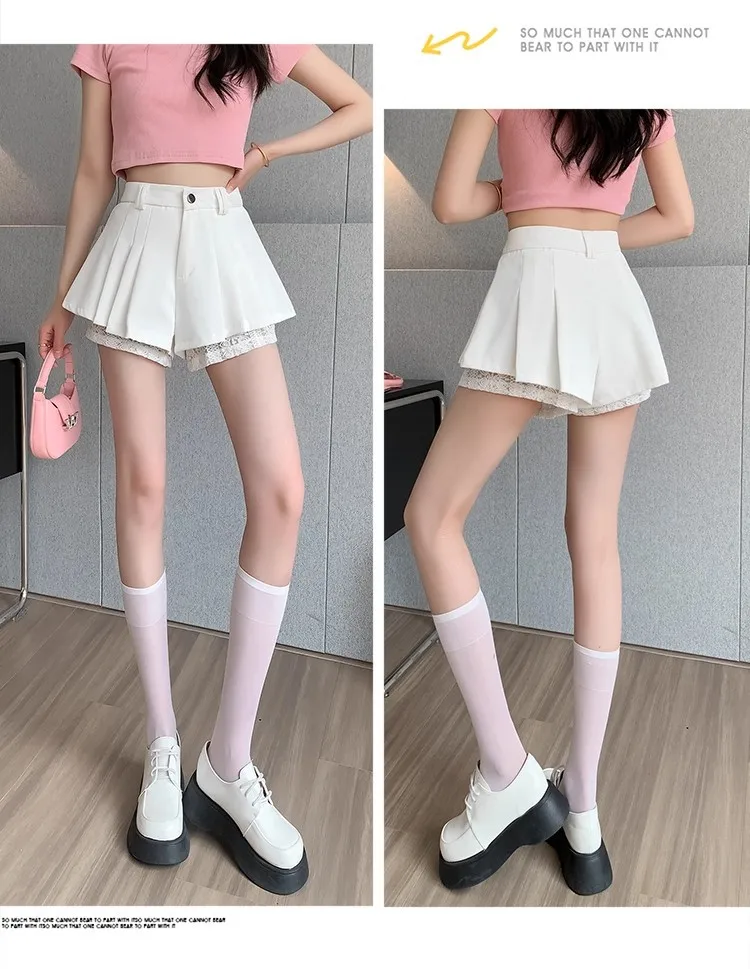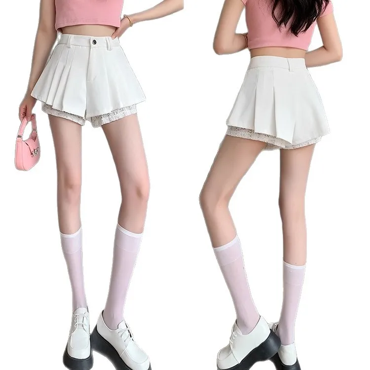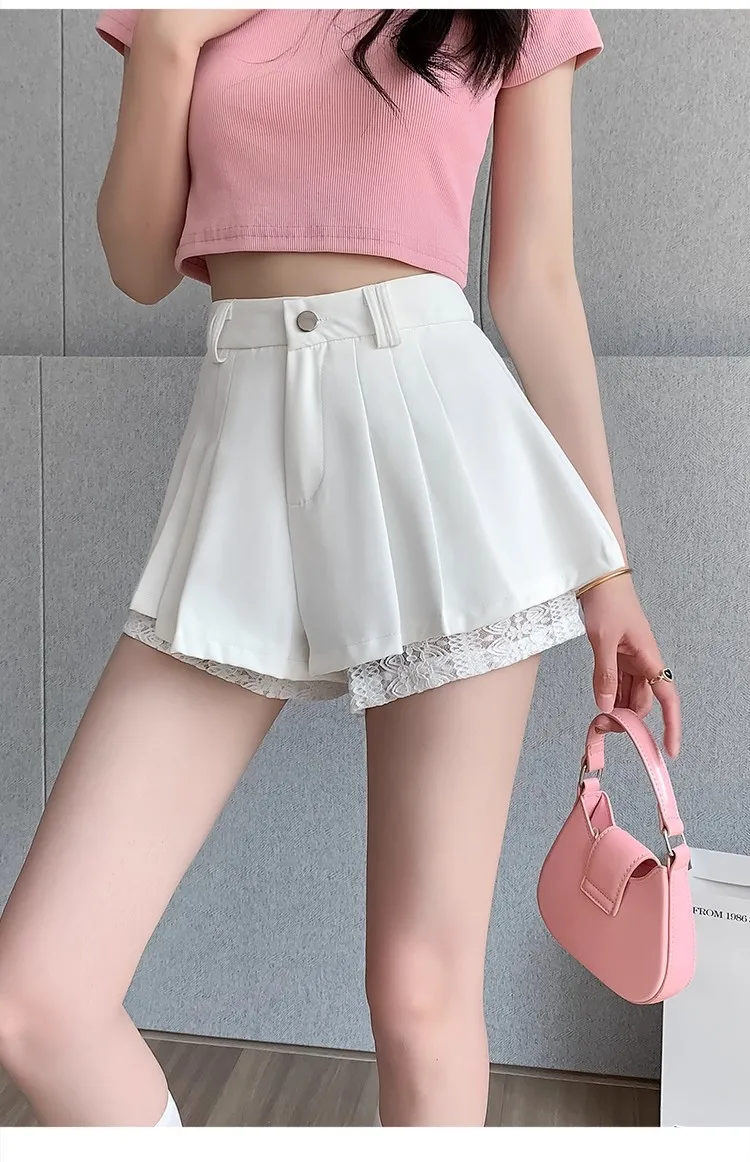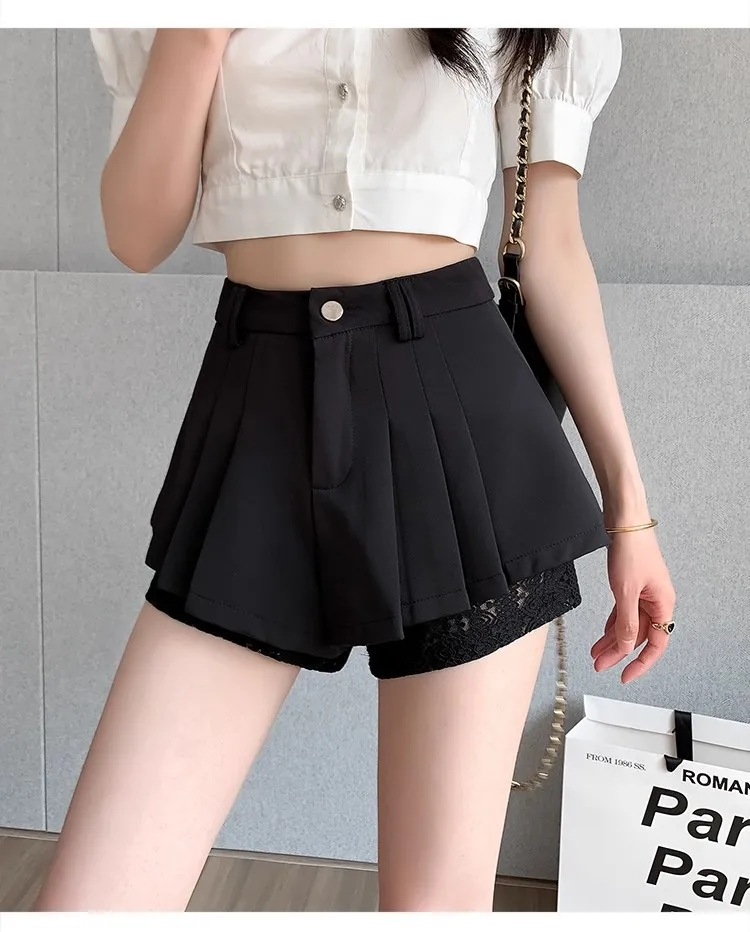 High Waist Lace Patchwork Silk Short Pants Women's Spring Summer Thin Wide Leg Skirt Pants Casual Style Small Size Pleated