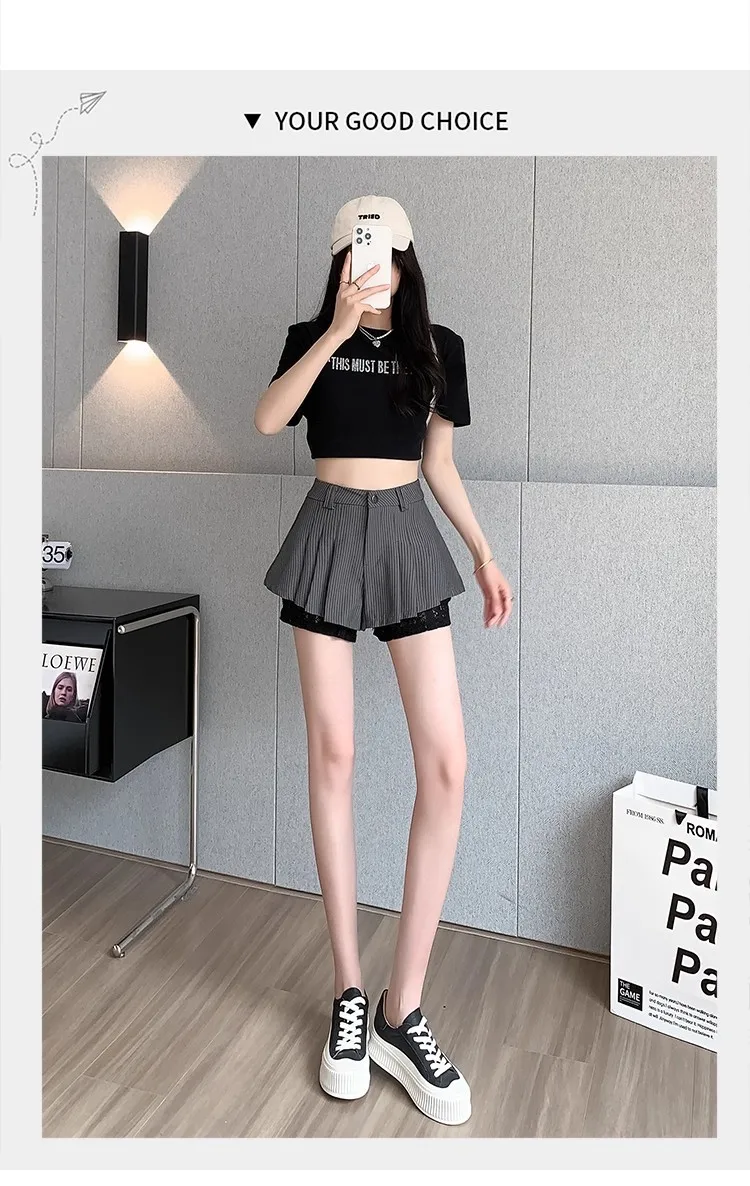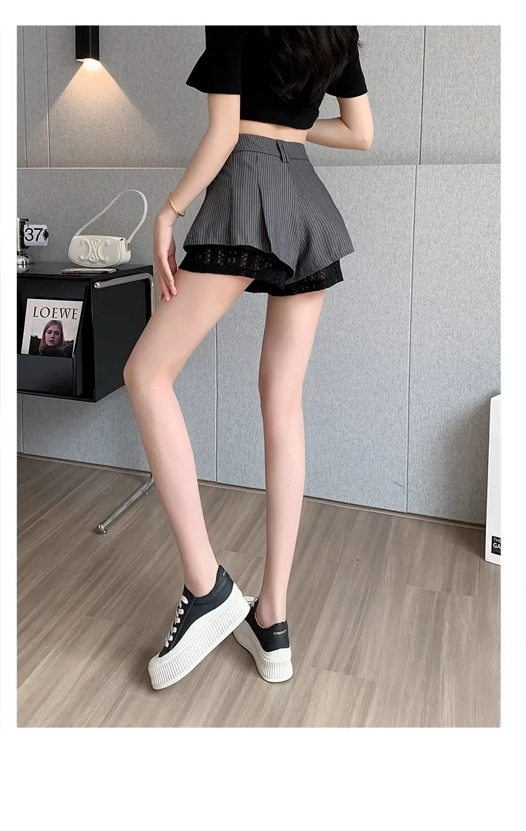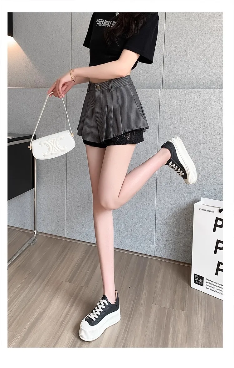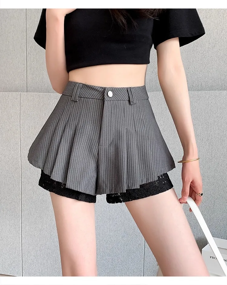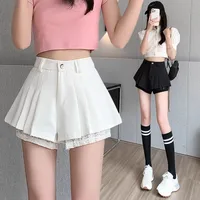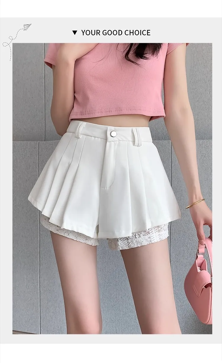 High Waist Lace Patchwork Silk Short Pants Women's Spring Summer Thin Wide Leg Skirt Pants Casual Style Small Size Pleated