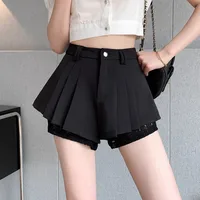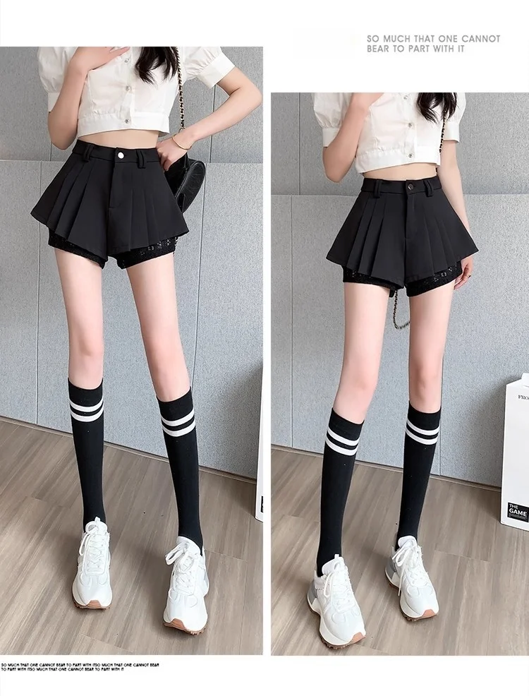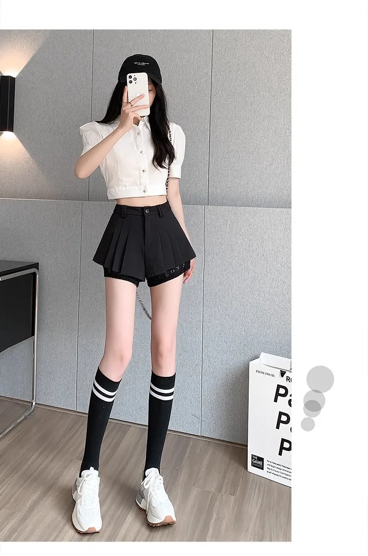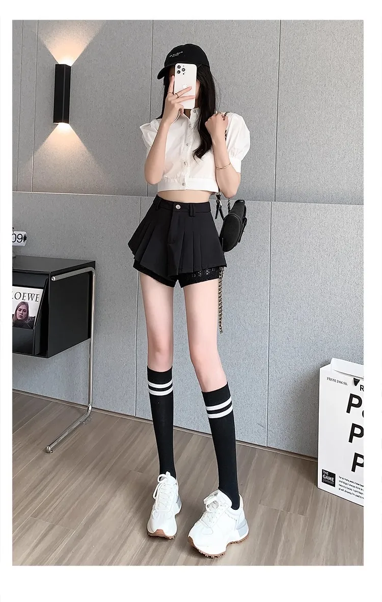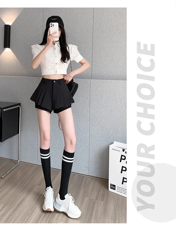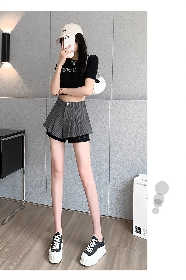 High Waist Lace Patchwork Silk Short Pants Women's Spring Summer Thin Wide Leg Skirt Pants Casual Style Small Size Pleated