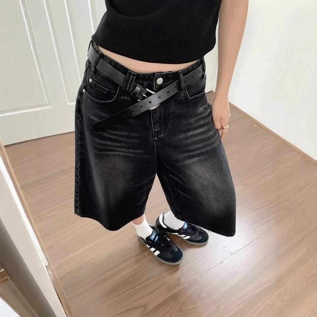 High Waist Wide Leg Seven-Five Denim Shorts Women’s Loose Casual Washed Slim Straight Tube Pants
