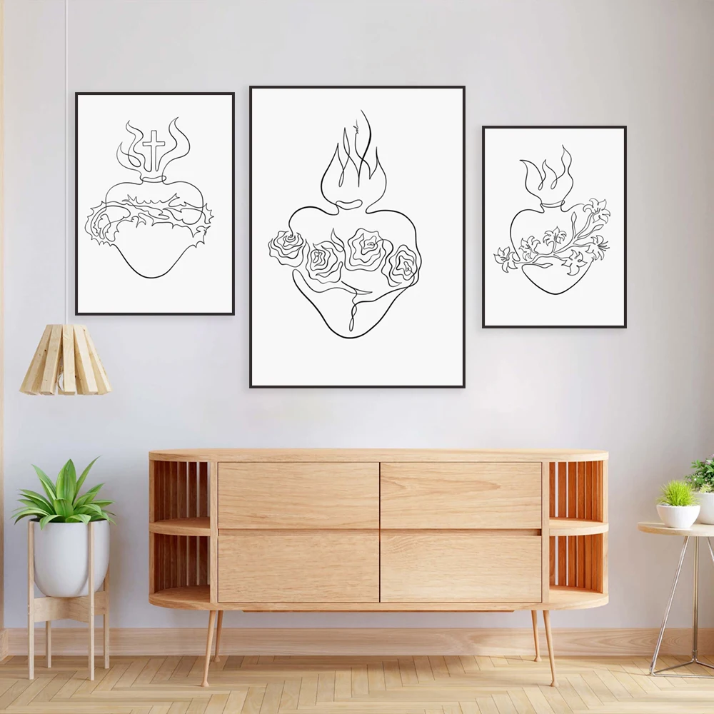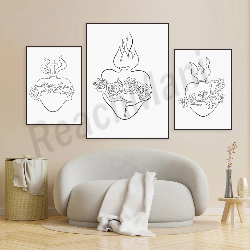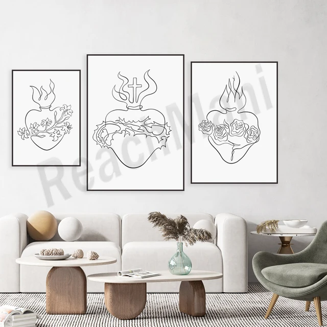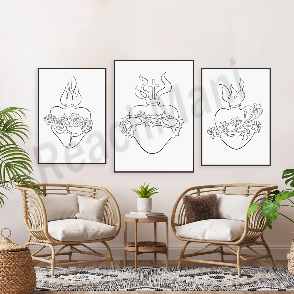 Holy Family Heart Art Print Sacred Heart of Jesus, Immaculate Heart of Joseph Catholic Line Art Wall Decor Poster