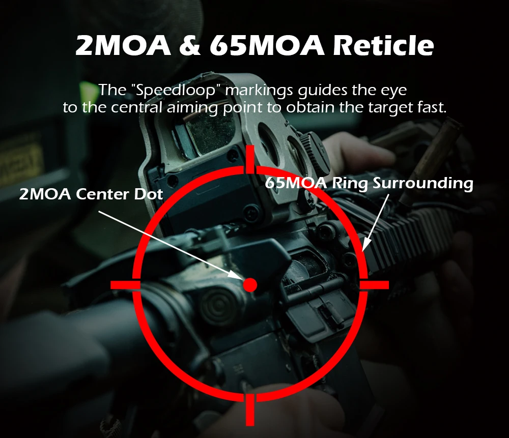 Fast holographic reticle (2 MOA center dot + 65 MOA ring) for rapid target acquisition
