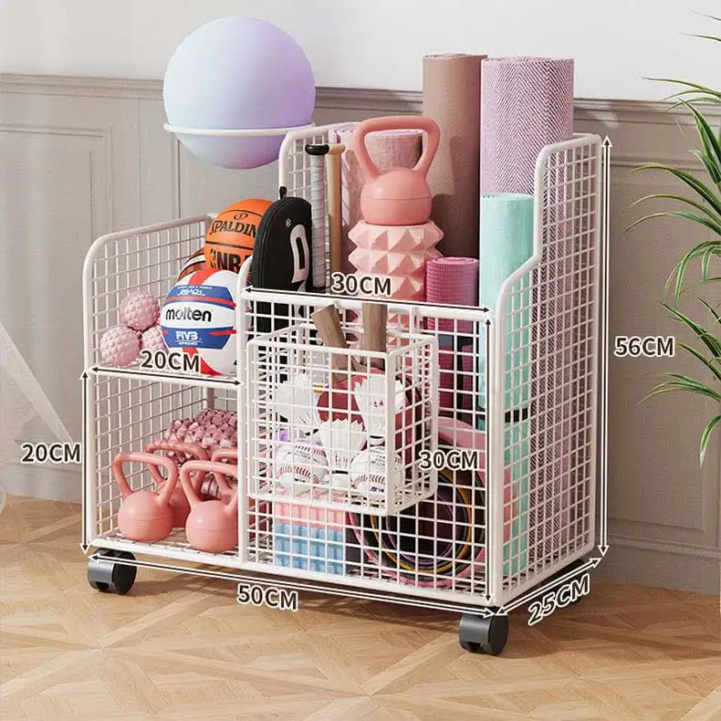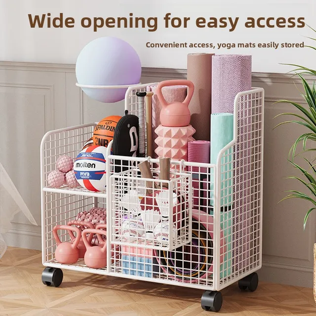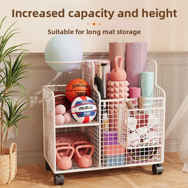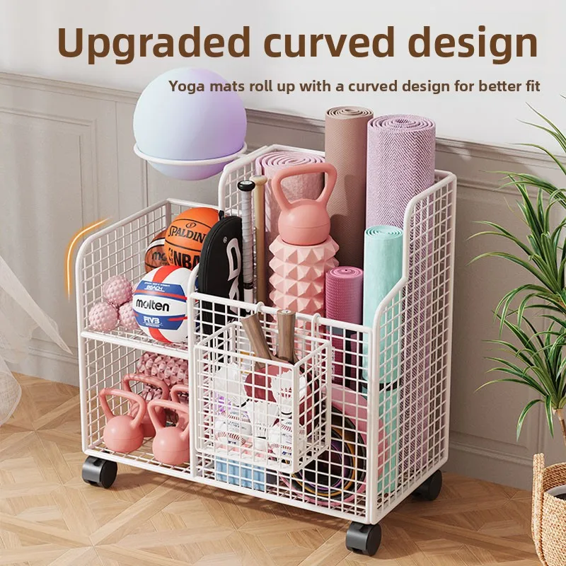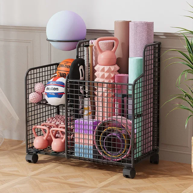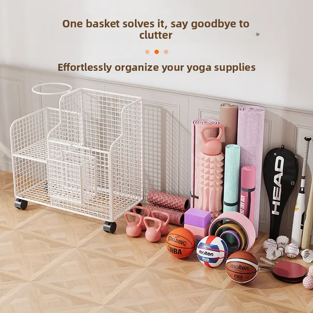 This Yoga Mat Storage Basket is a versatile solution for organizing your home gym equipment, including badminton rackets, dumbbells, and basketballs.