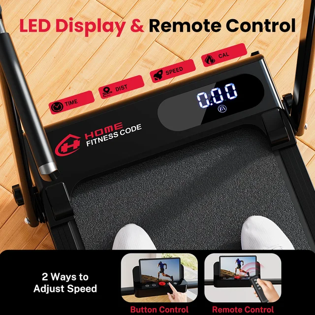–LED Display & Remote Control – Check your time, speed, calories, and distance easily, and control the treadmill via remote or handrail buttons.