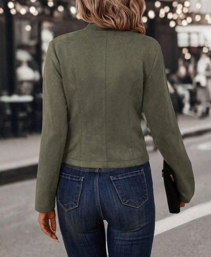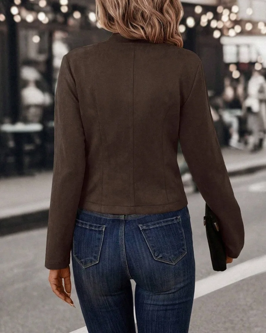 The jacket features a pure color design, offering a classic and sophisticated look that complements any outfit.