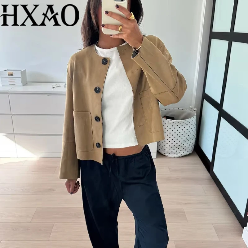 HXAO Khaki Fleece Jacket Outerwears 2024 Women Autumn Winter Long Sleeve Varsity Jacket Coat Ladies Fashion