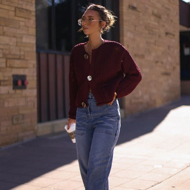HXAO Women's Sweater Crochet Oversize Cardigan Autumn Crop Knit Button O-Neck Knitwear Loose Long Sleeve Top Women Cozy Sweaters