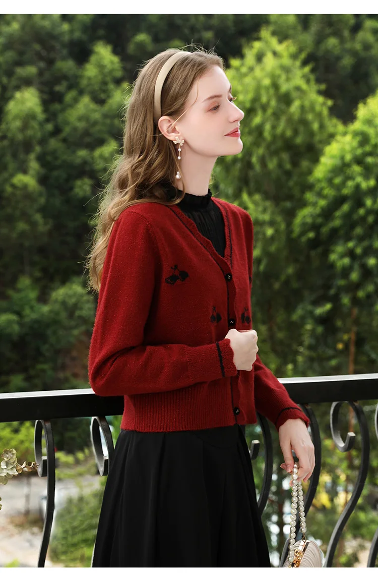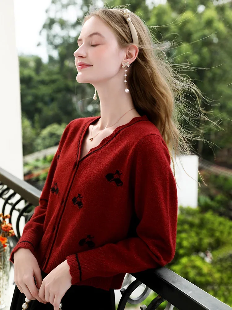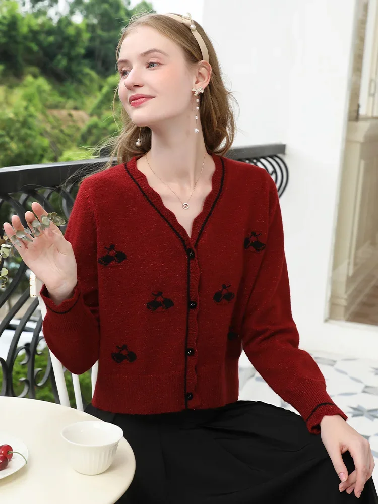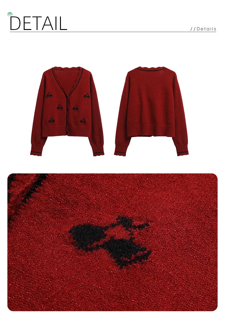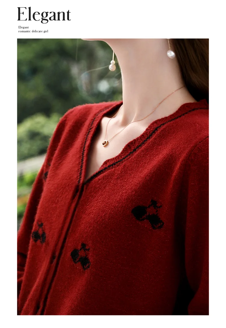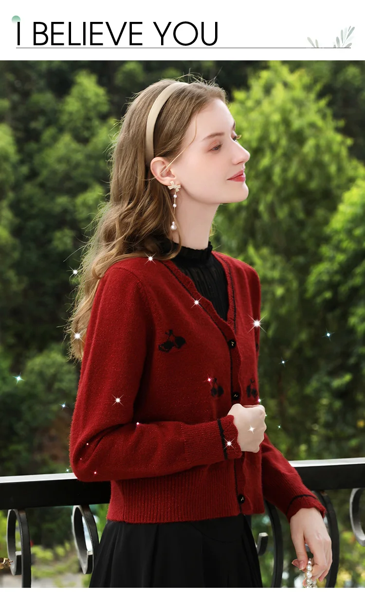 I BELIEVE YOU Red Casual Sweater Knitted Coats for Woman V-neck Office Lady Short Cardigan Fall Clothes