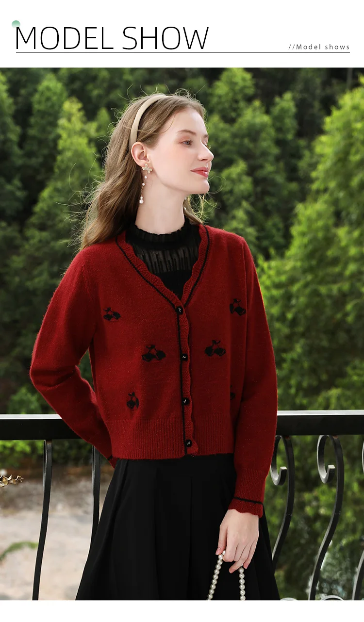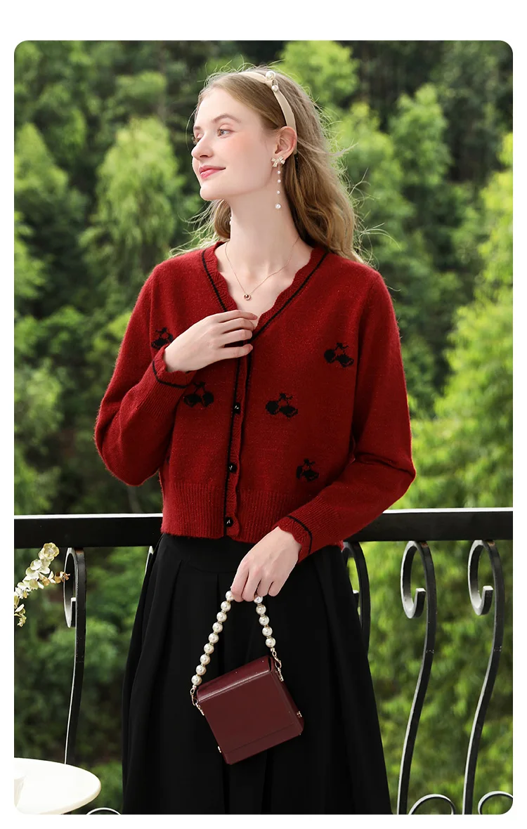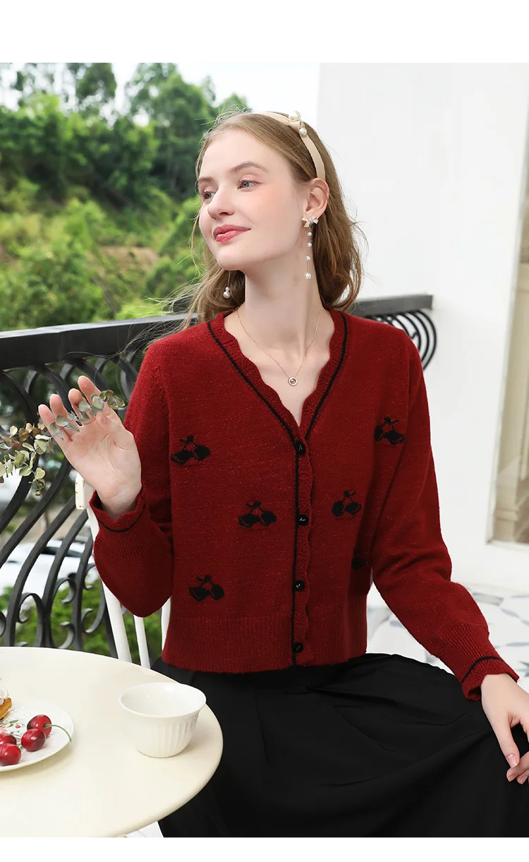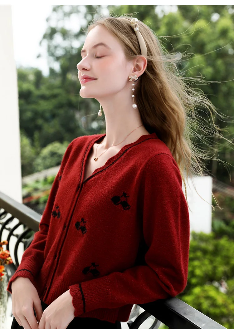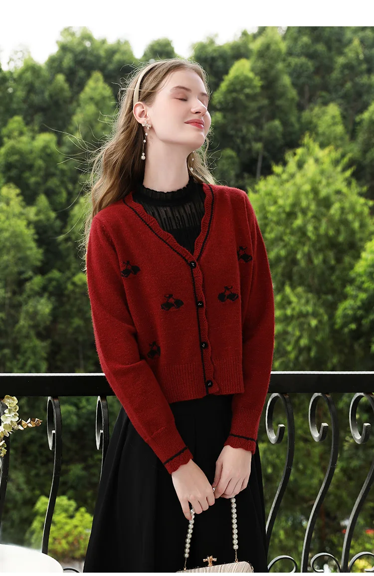 I BELIEVE YOU Red Casual Sweater Knitted Coats for Woman V-neck Office Lady Short Cardigan Fall Clothes