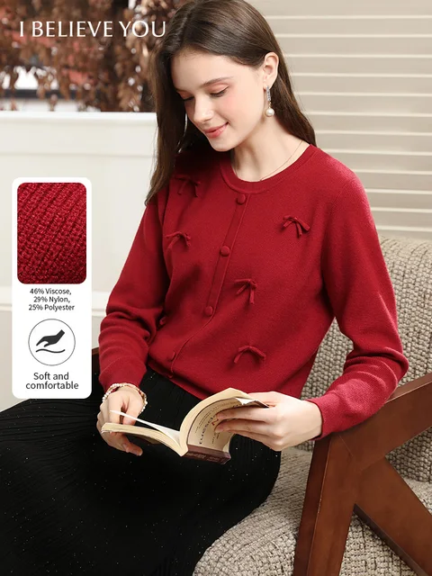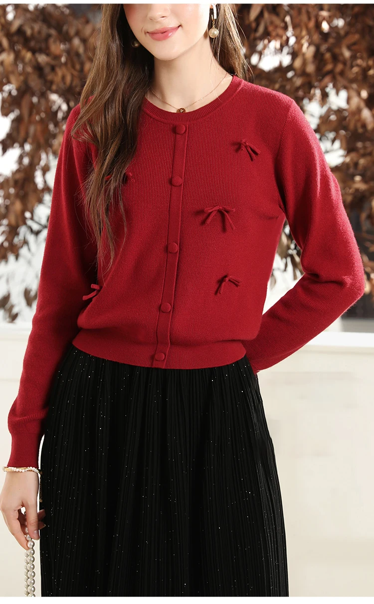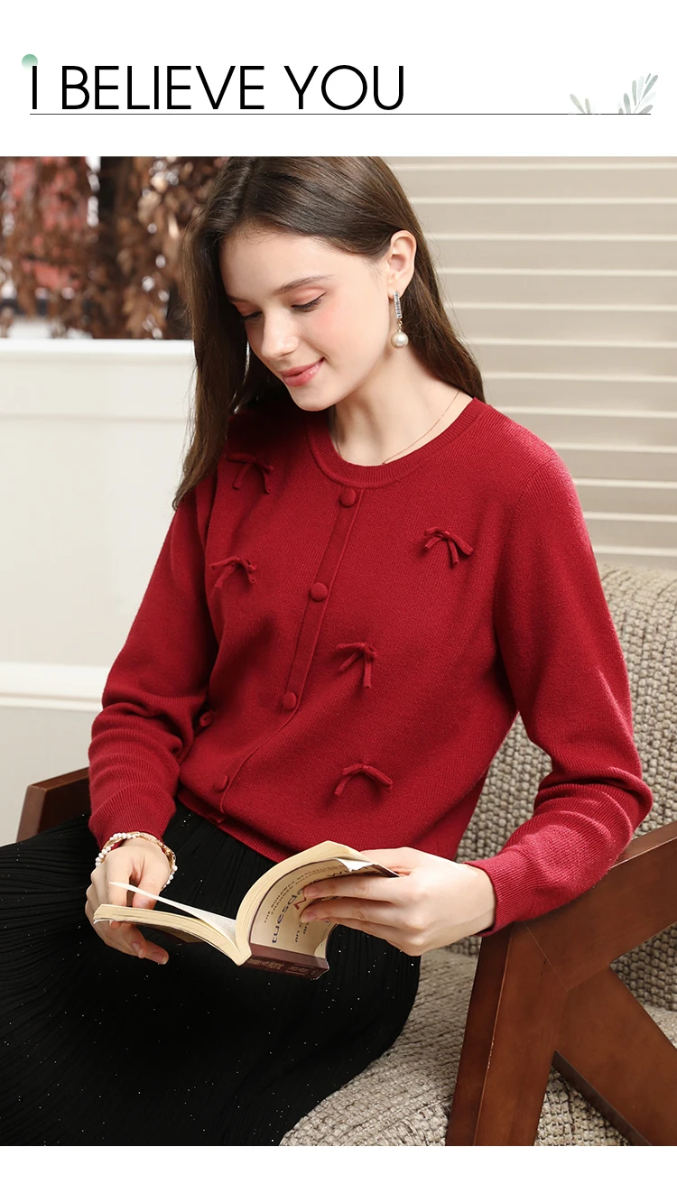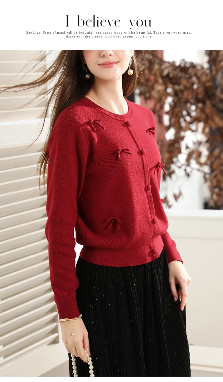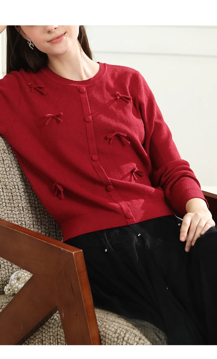 I BELIEVE YOU Woman Sweaters 2025 Sutumn Red French 3D Bow Knit Pullovers Casual O-neck Long Sleeves