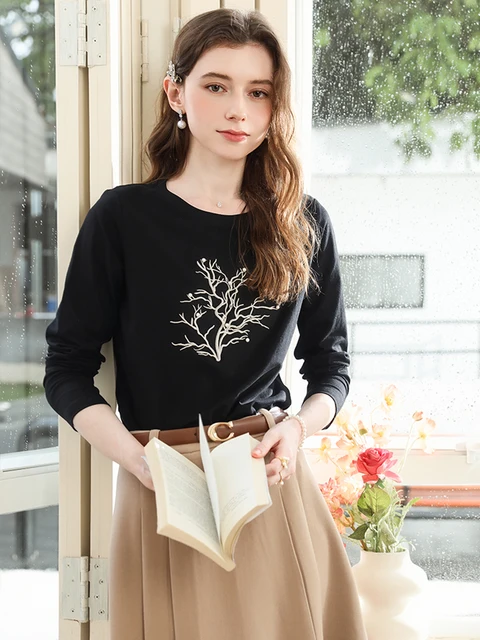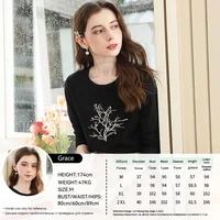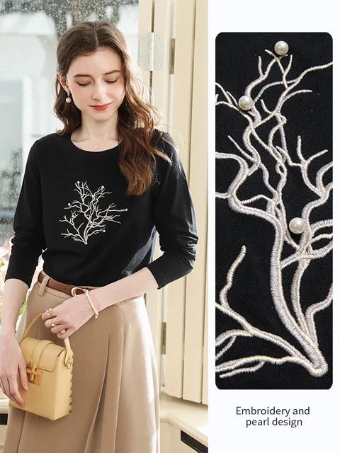 I BELIEVE YOU Women’s Long Sleeved T-shirt 2025 Autumn Fashion Black Embroidered Nail Bead Casual