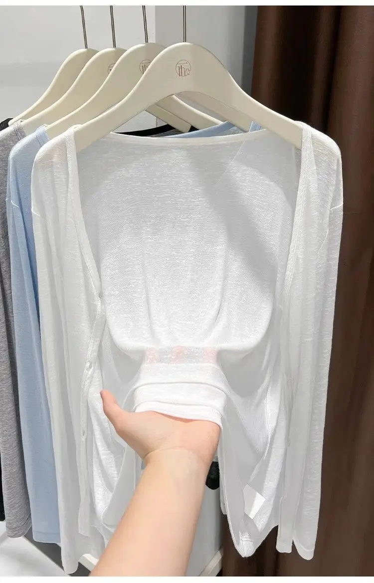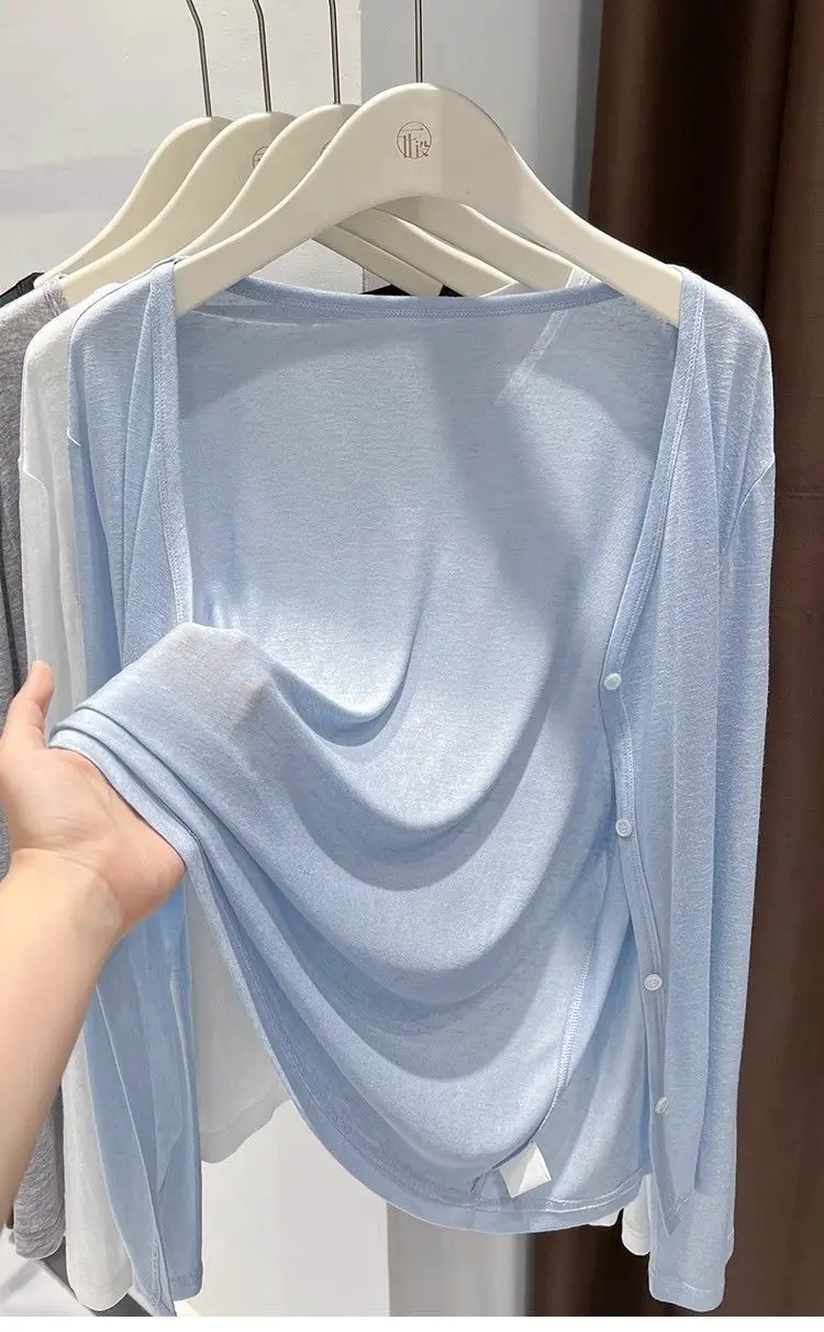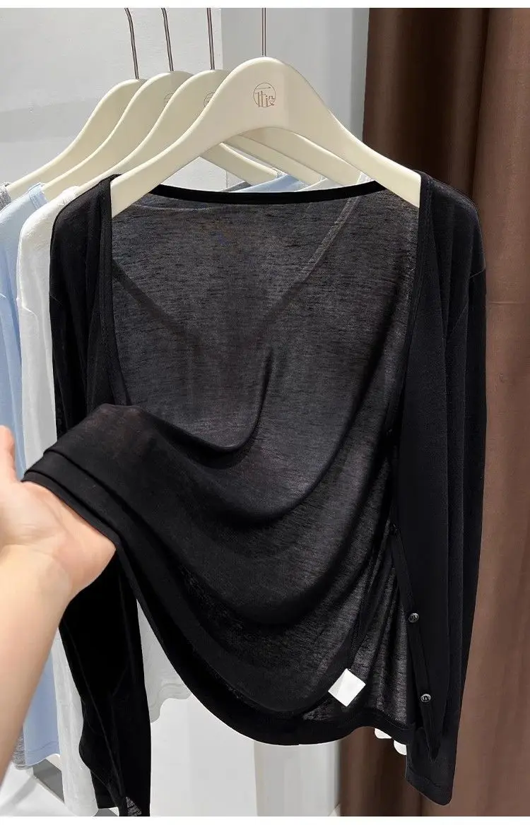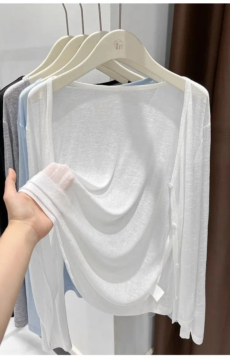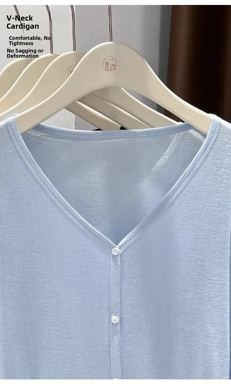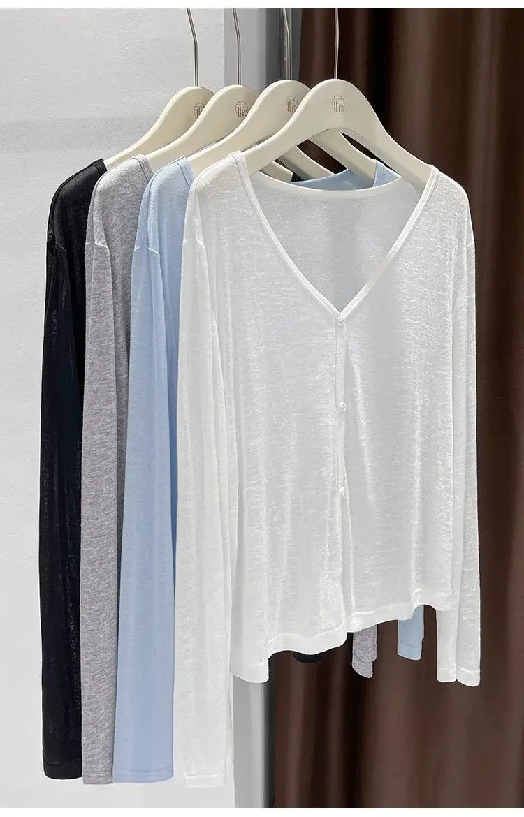 With long sleeves and a V-neck design, this cardigan provides both style and functionality, suitable for the summer season.