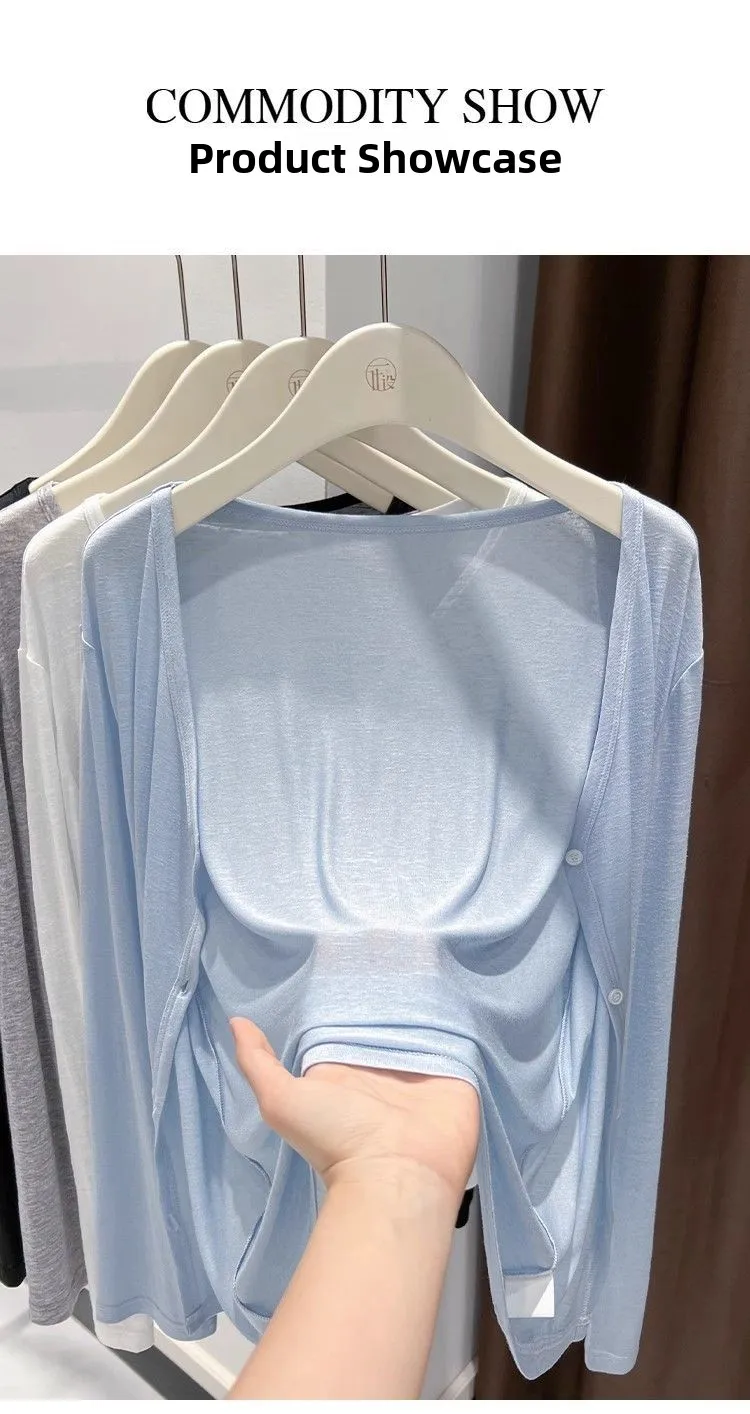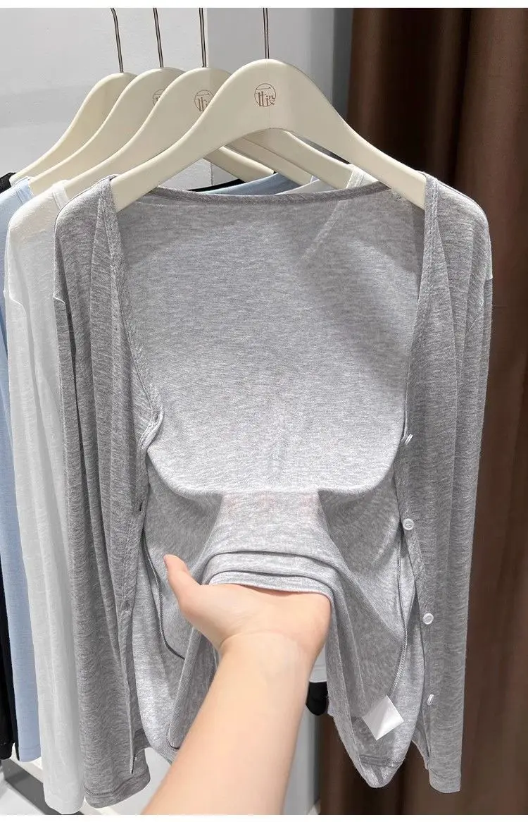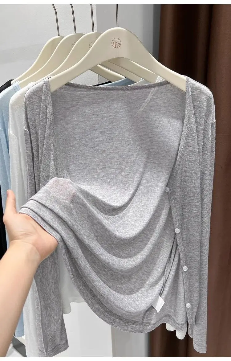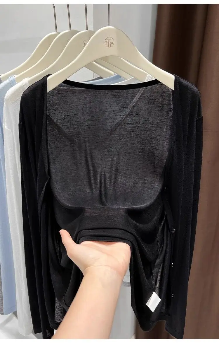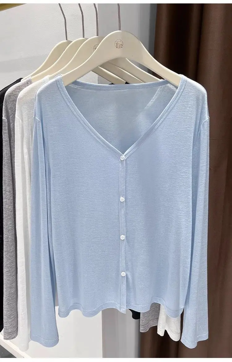 With long sleeves and a V-neck design, this cardigan provides both style and functionality, suitable for the summer season.