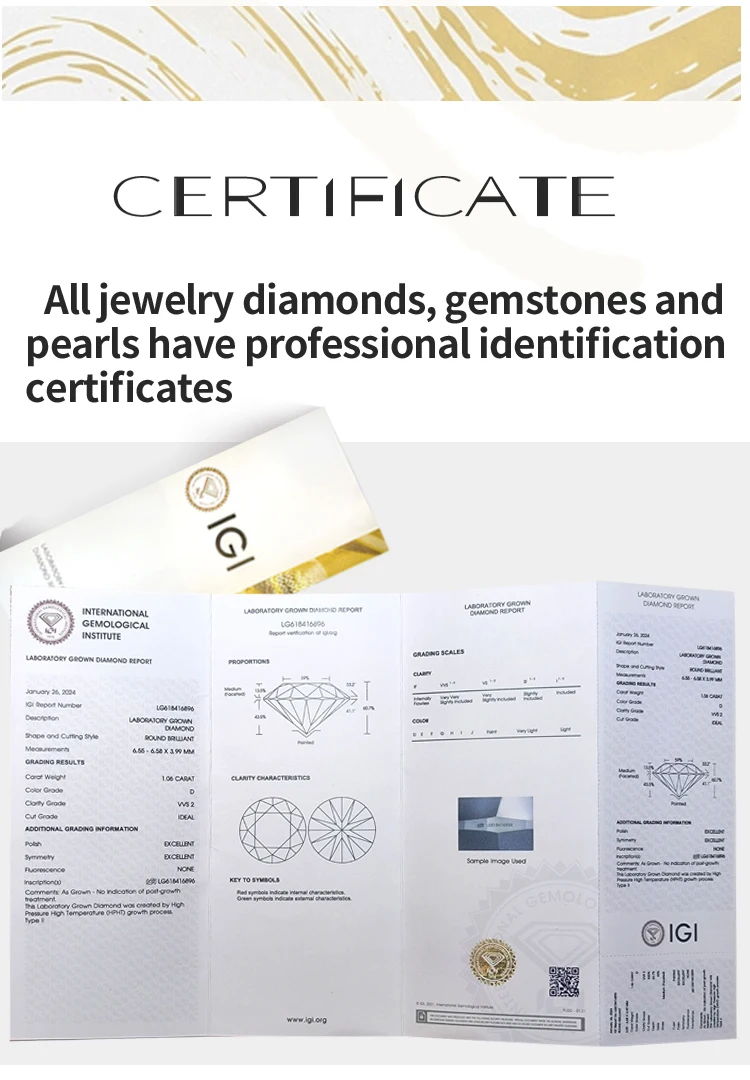 All jewelry comes with professional appraisal certificates. The type of certificate varies depending on the product line and purchase options, with the majority of jewelry featuring both a loose diamond certificate and a finished jewelry certificate. For specific details, please consult customer service.