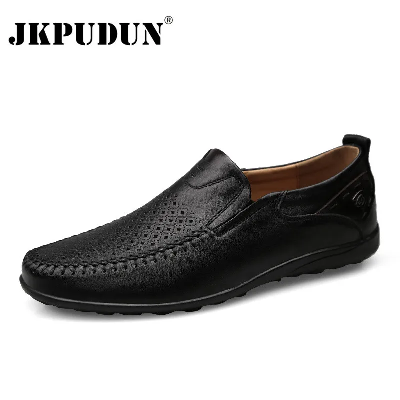 JKPUDUN Italian Men Casual Shoes Summer Genuine Leather Men Loafers Moccasins Slip On Men's Flats Breathable Male Driving Shoes