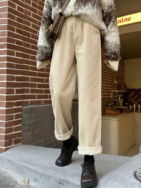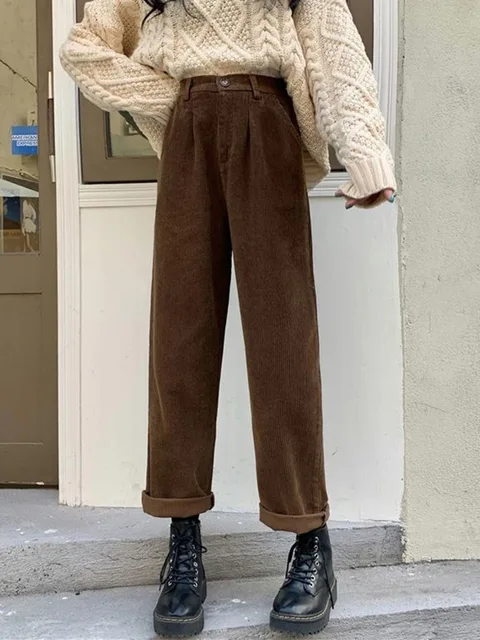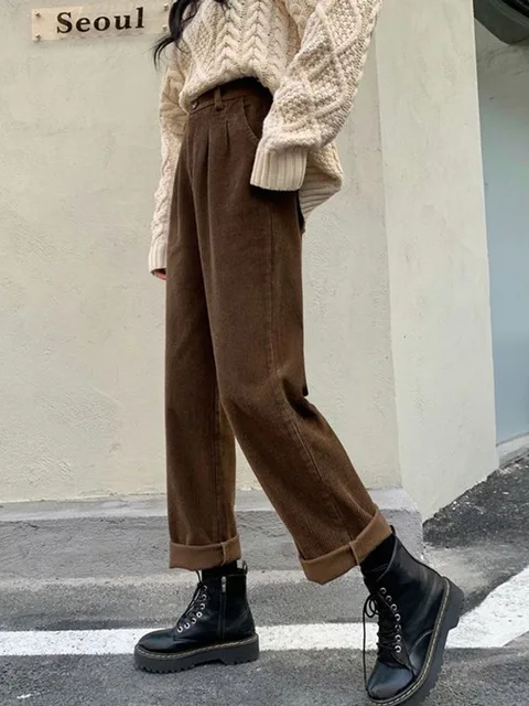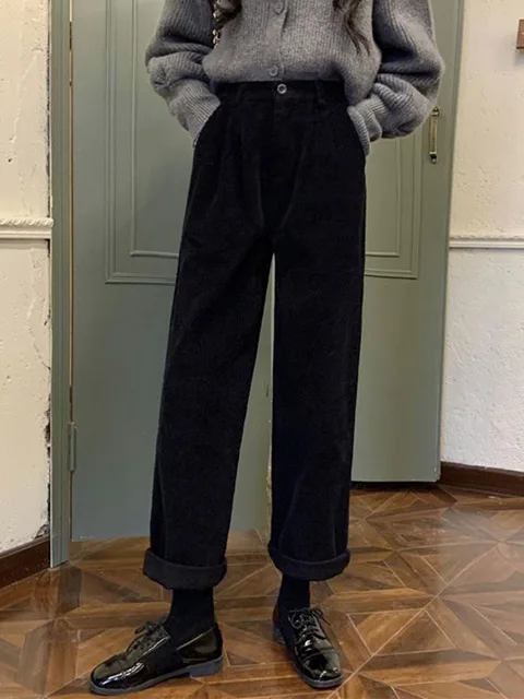 Jmprs Vintage Corduroy Pants High Waist Spring Straight Trousers Causal Pockets All Match Female Black