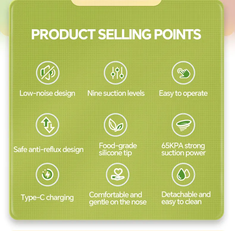 3. With a powerful 65KPA suction force, the rechargeable nose cleaner effortlessly extracts thick mucus, providing instant relief from nasal congestion. Its anti-backflow technology ensures cleanliness and hygiene.