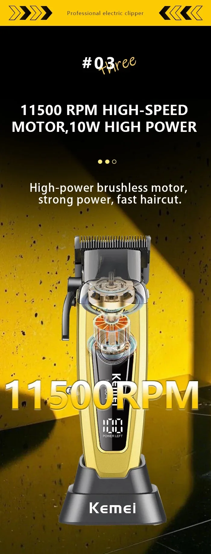 High Power brushless Motor: Since the dawn of time, barbers and stylists have desired a clipper the size of their hand, operating as an extension of their arm. The kemei Hair Clipper not only has an incredible compact size, but has faster blade speed and more power than any clippers before. Powered by a 7500 RPM brushless motor the hair clipper knows to increase torque and power to combat any thickness, texture, or length of hair effortlessly