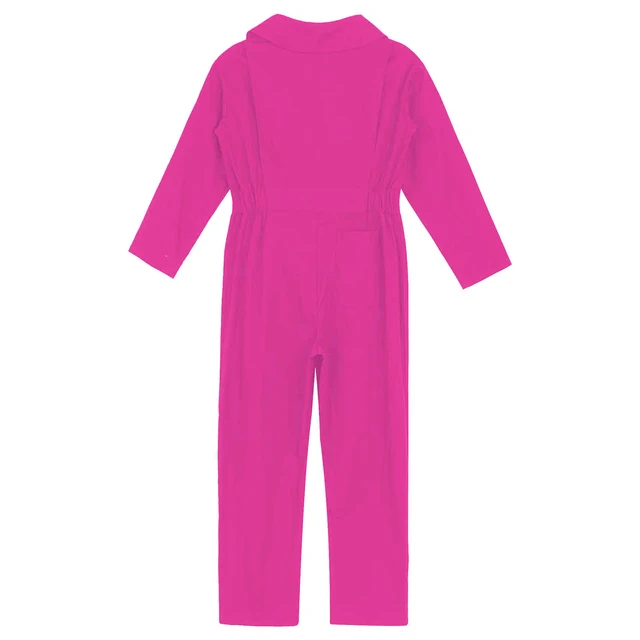 The jumpsuit with long sleeves and turndown collar, simple solid color design.