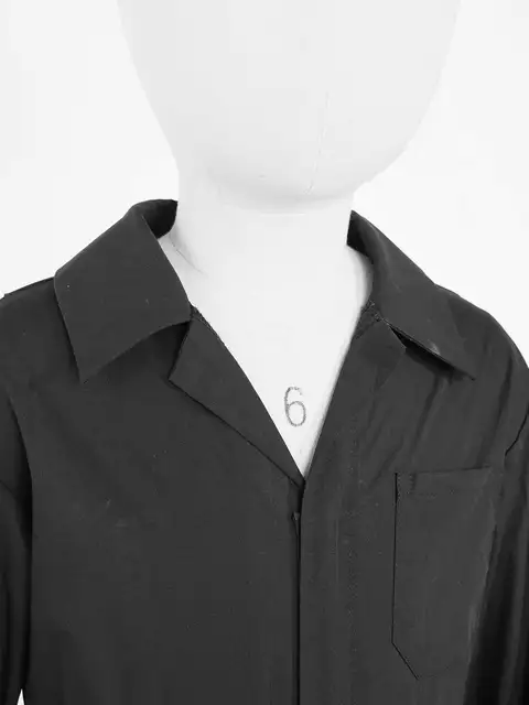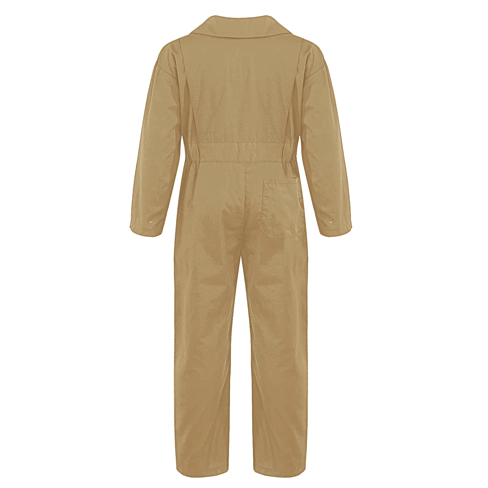 The jumpsuit with long sleeves and turndown collar, simple solid color design.