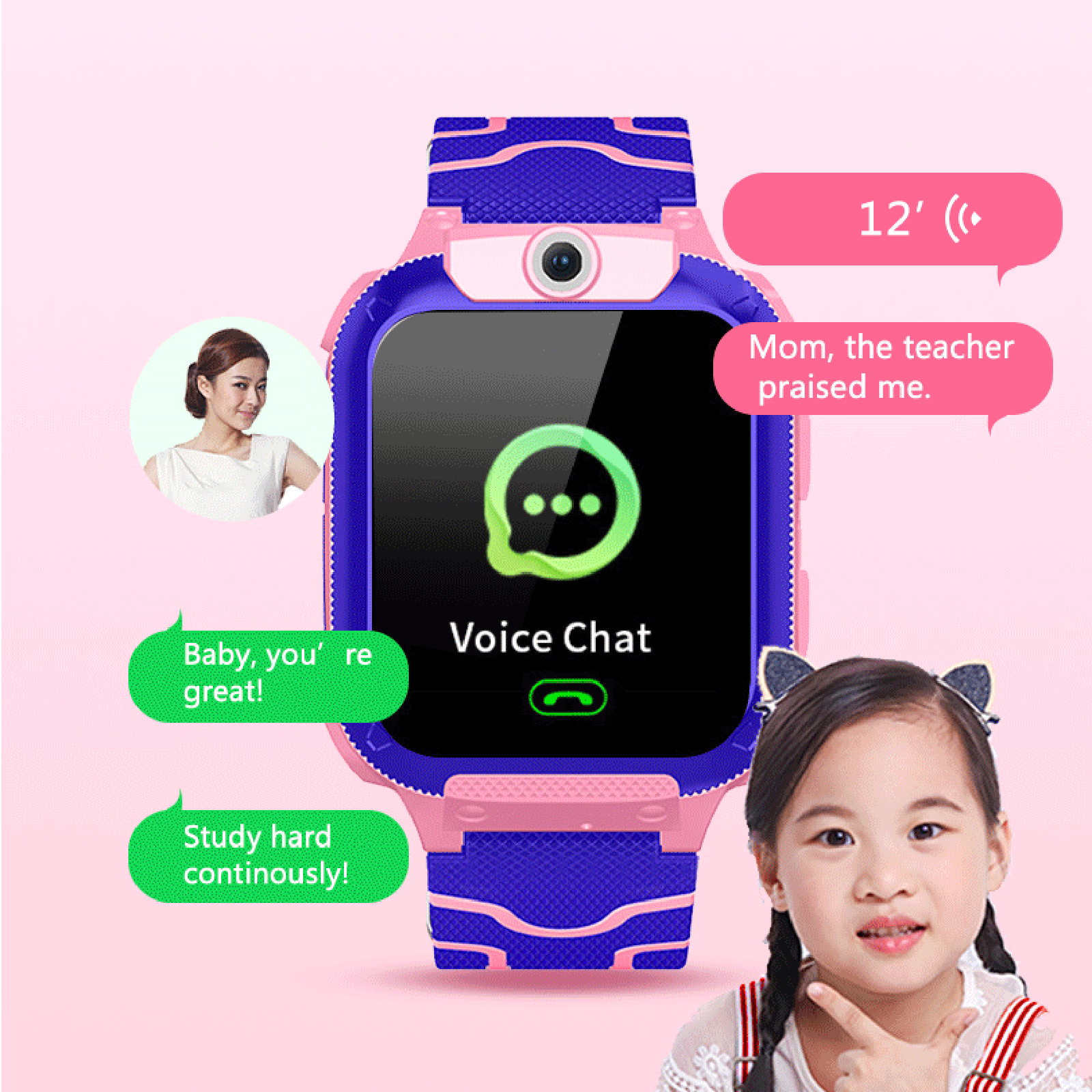Functions: real time location; Phone book; Voice chat; route; phone book; Healthy pedometer; Remote power off; Safe zone; SOS for help; location ways; Alarm remind;Forbidden in class; Two way talking; Camera; Flashlight; Monitoring (wire tapping);