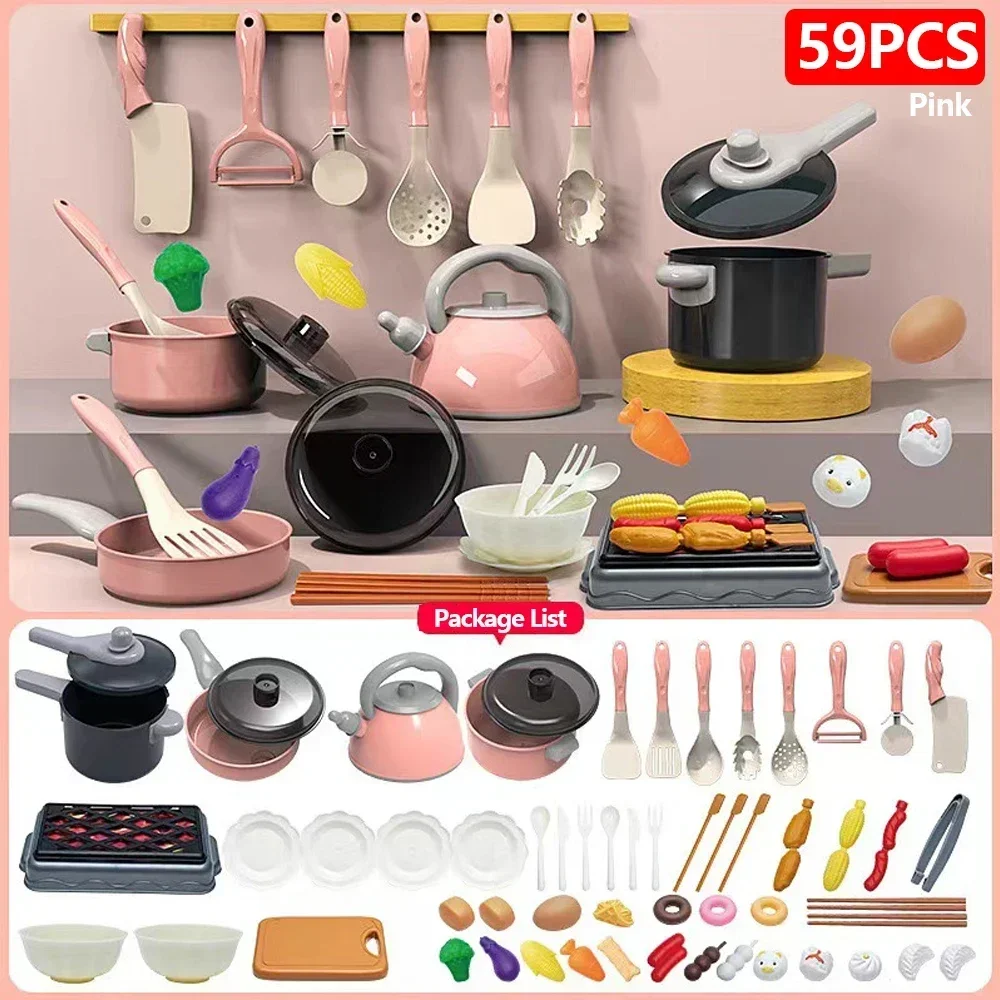 1. Complete Toy Kit -This pretend cooking sets include pots and pans, plates and dishes, kettle, spoon, shovel, fork, cutting board, fake food like fruits and vegetables/egg/fast foods etc. Great cute addition for any play kitchen.