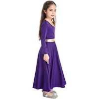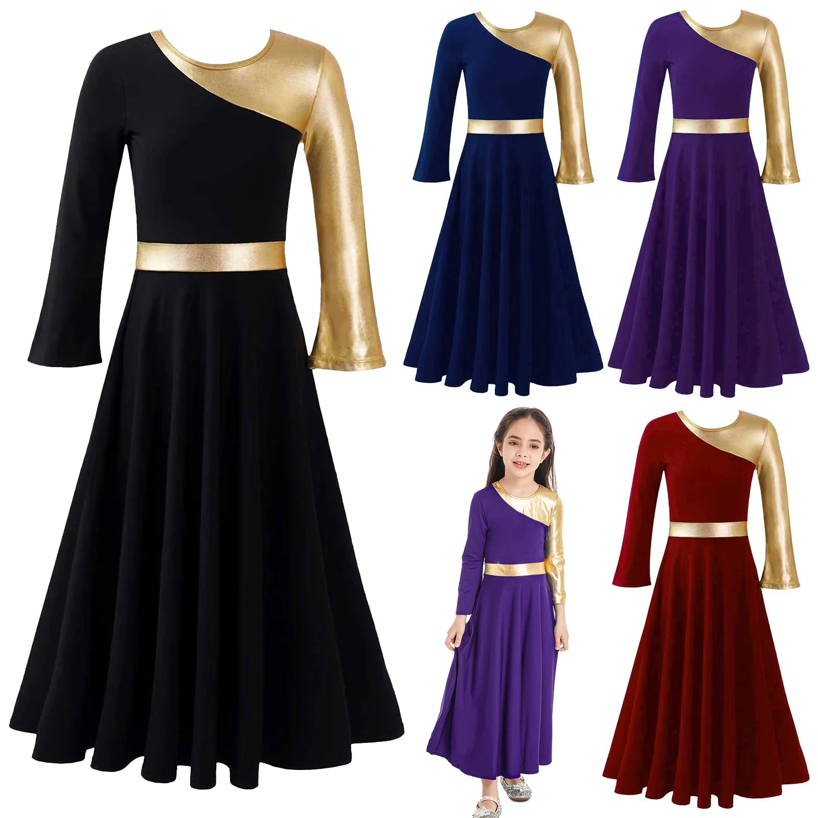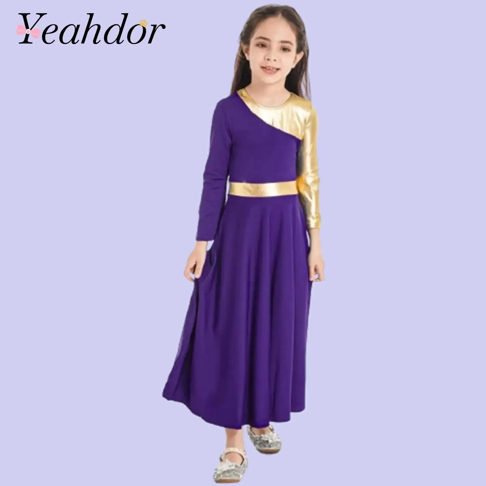 Kids Girls Lyrical Gowns Worship Costume Church Dance Dress Bell-bottom Long Sleeve Metallic Liturgical Praise Church Dancewear