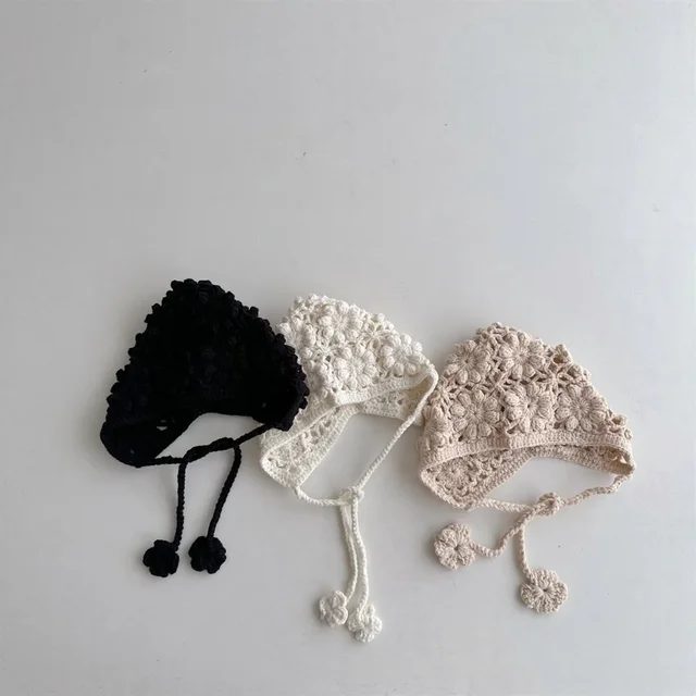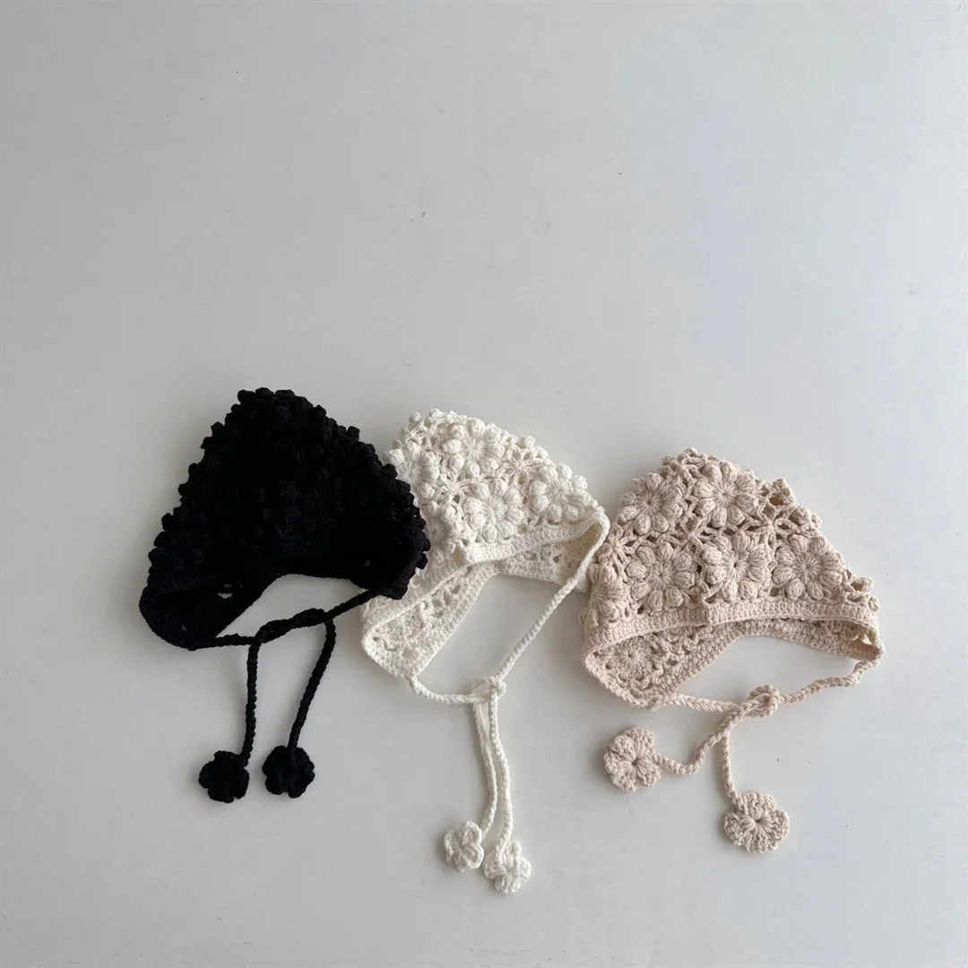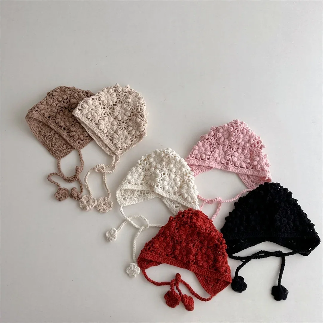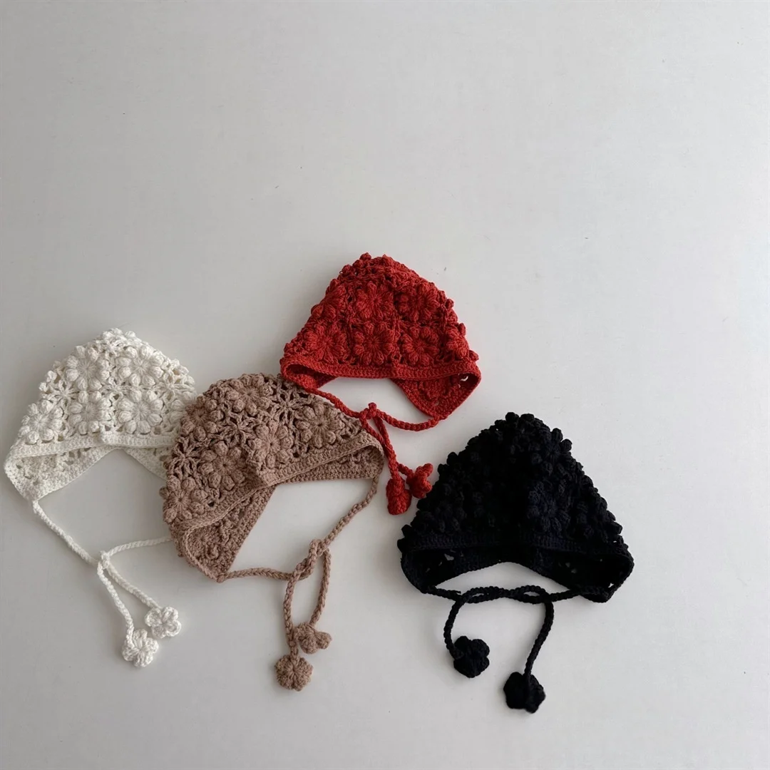 Knitted Baby Hat Kids Girls Handmade Crochet Ear Flap Beanie Cute Hollow Out Warm Spring Headwear Fashion