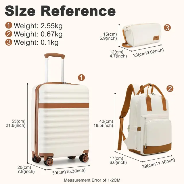 20-Inch Suitcase Set:The suitcase set is 3 pieces which includ a 20-inch cabin suitcase(55x39x20cm), a travel backpack and a toiletry bag. The carry-on case fits most airline carry-on size restrictions, making it perfect for short trips. Travel bag and toiletry bag provide extra storage space for your hand luggage. With a trolley sleeve design, this travel bag can be easily attached to the retractable luggage handle, making your travel easier and more convenient.