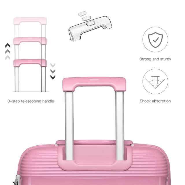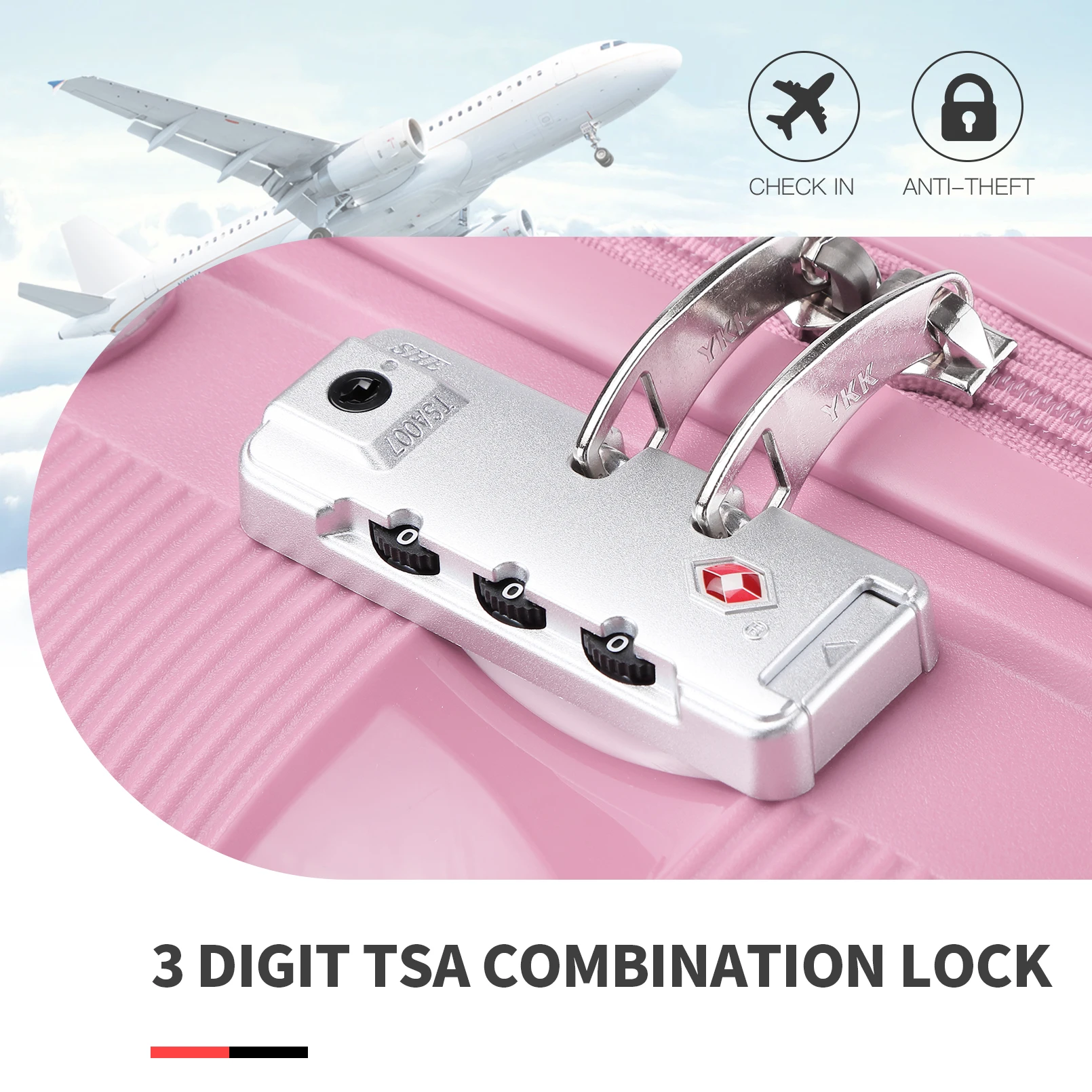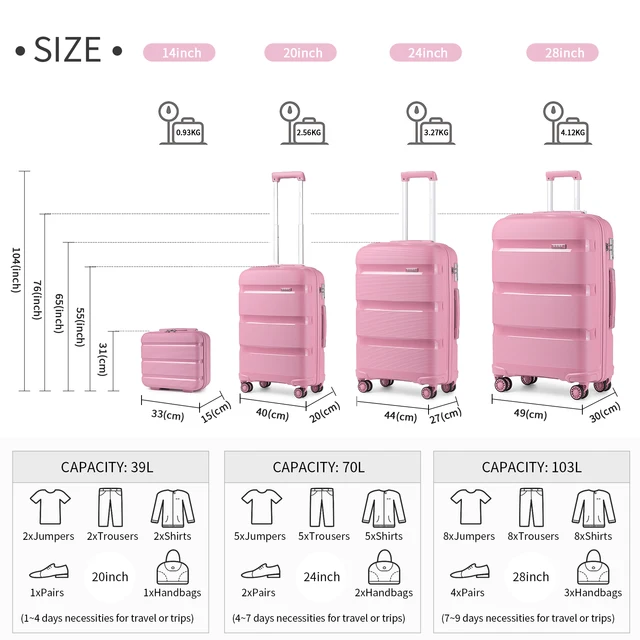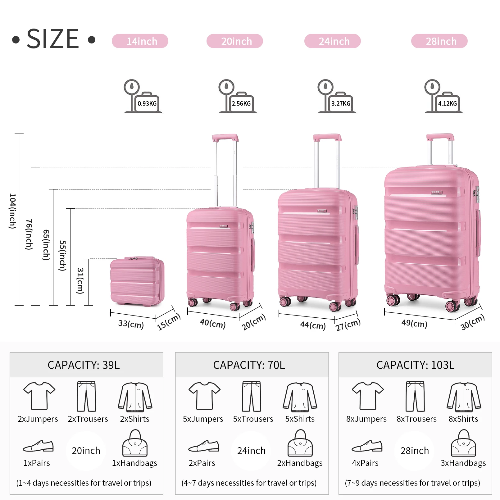 DIMENSIONS: [14inch] 31*33*15cm; Weight: 0.93kg; Capacity: 15L. [20inch] 55*40*21cm; Weight: 2.56kg; Capacity:40L.[24inch] 65*44*27cm; Weight: 3.27kg; Capacity: 66L. [28inch] 76*49*30cm; Weight: 4.12kg; Capacity: 100L. STURDY & WELL-ORGANIZER:This spinner large capacity luggage sets mainly crafted by 100% Polypropylene(PP) and with scratch-resistant textured finish. Compared with ABS and PC plastic, the PP material is more lightweight and sturdy. And the interior is also designed with mesh pocket, zipped divider and cross-strap to maximize your packing power and you can pack your belongings more reasonably.YKK ZIPPER: This travel trolley case equipped with YKK zipper that used in most entry luxury brand hard shell suitcase. It uses 5 strands thread to protect the rubber teeth from deformation and lifting, 3 times stronger than normal zipper.(Ordinary zippers only use 2 strands thread).TSA LOCK: Built-In friendly-user TSA accepted lock, great for international travel because having the TSA lock makes sure that your valuables are safe and that the TSA agent is able to check your luggage without breaking the lock. Ensure security while traveling.SILENT SPINNER WHEELS+TELESCOPIC HANDLE+SHORT HANDLE: Four multi-directional wheels benefit from new soft TPE, ensuring smooth 360° rotation. The aluminum telescopic handle is more sturdy and lighter, The side easy grab handle can be really handy when lifting the suitcase with heavy weight.