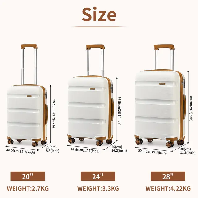 1. 【3-Size Options】Includes, 20″ (55x40x21cm/2.56kg/40L), 24″ (65x44x27cm/3.27kg/66L), and 28″ (76x49x30cm/4.12kg/100L) suitcases. Crafted with 100% lightweight polypropylene (PP) material, offering superior durability and scratch resistance compared to ABS/PC cases.