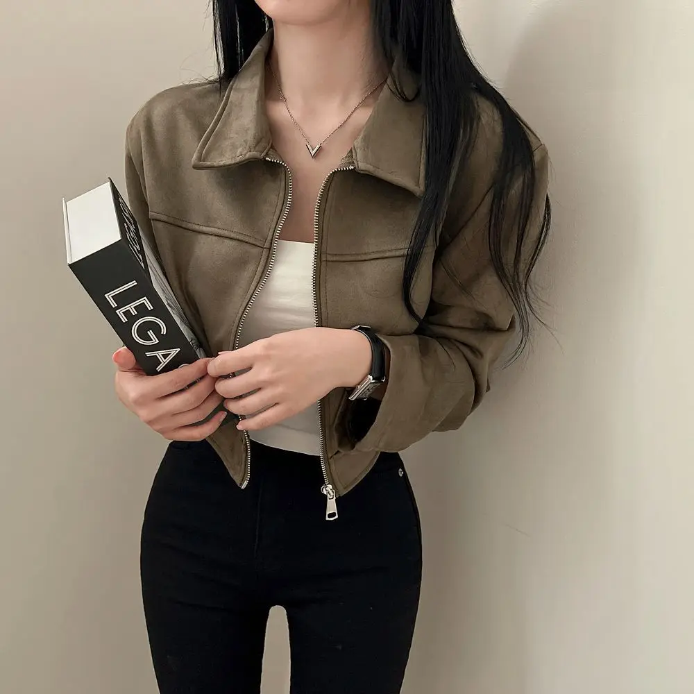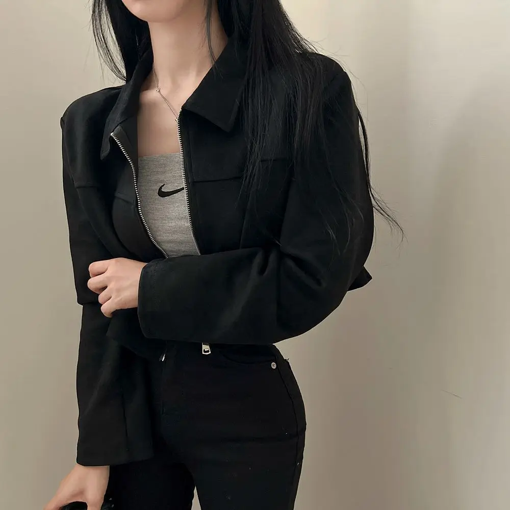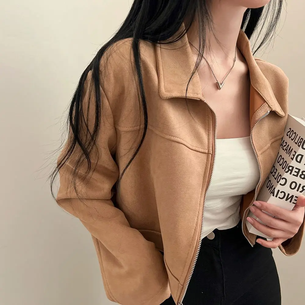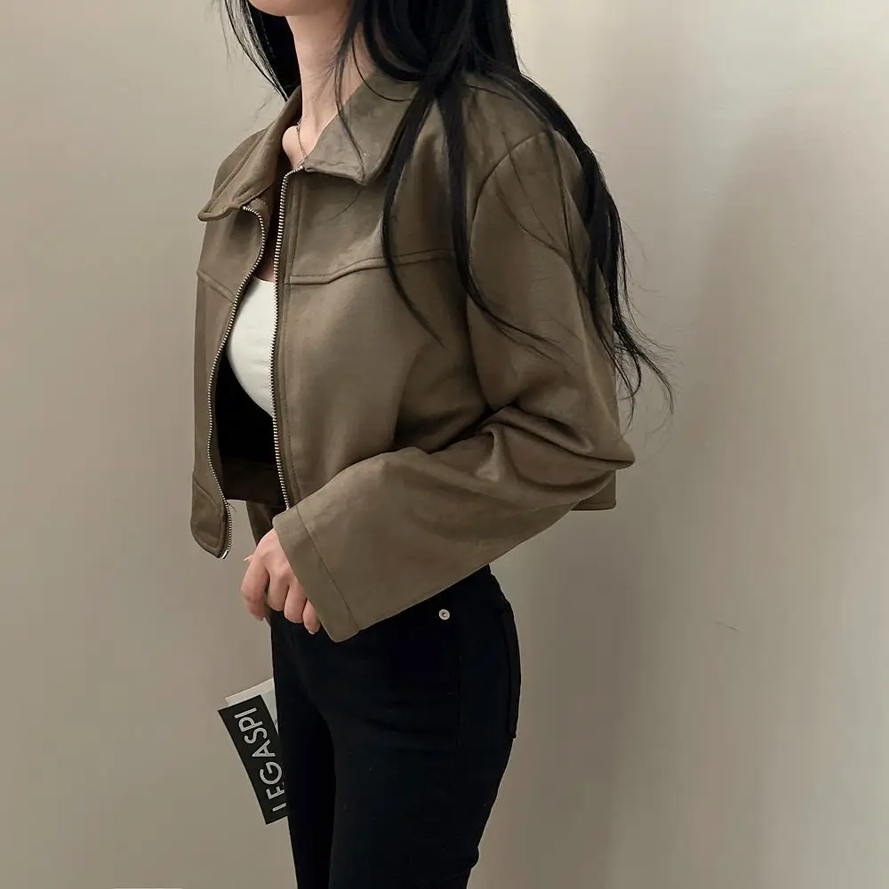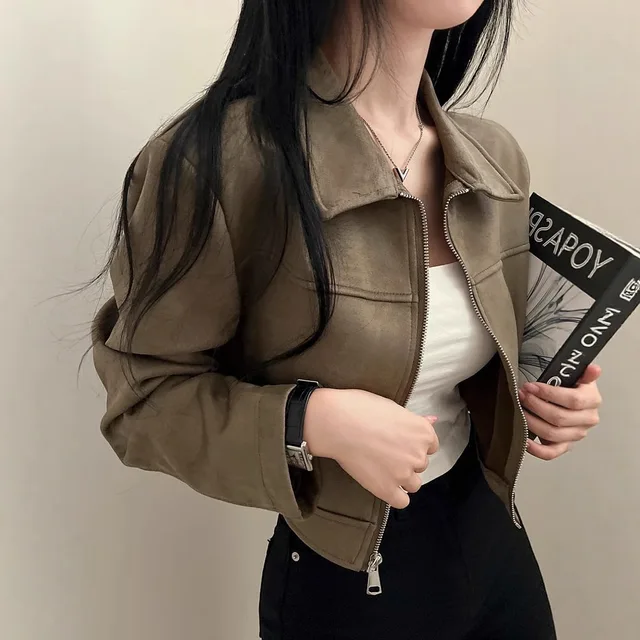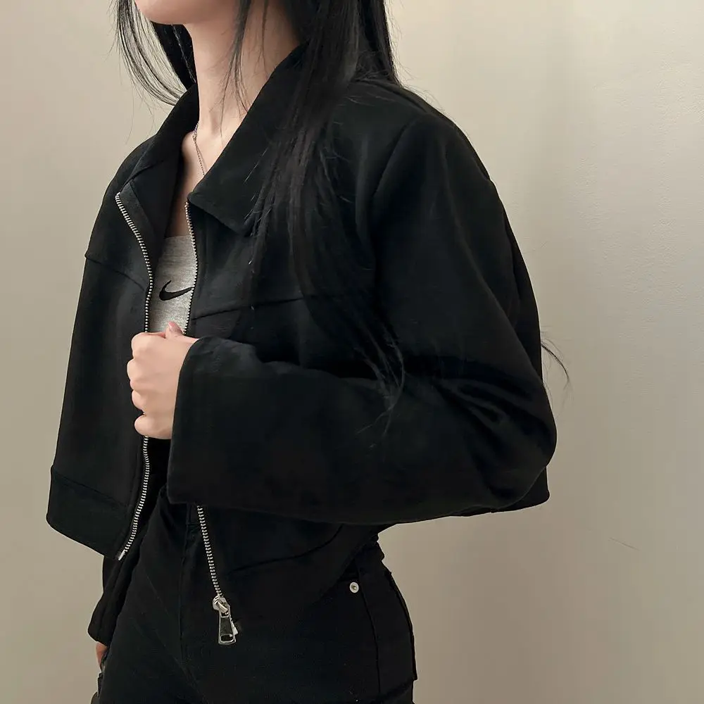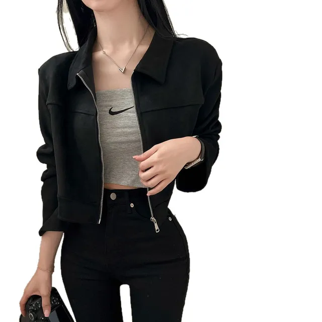 The short, sleek design of this jacket adds a modern touch to any outfit, making it a staple piece for the autumn season.
