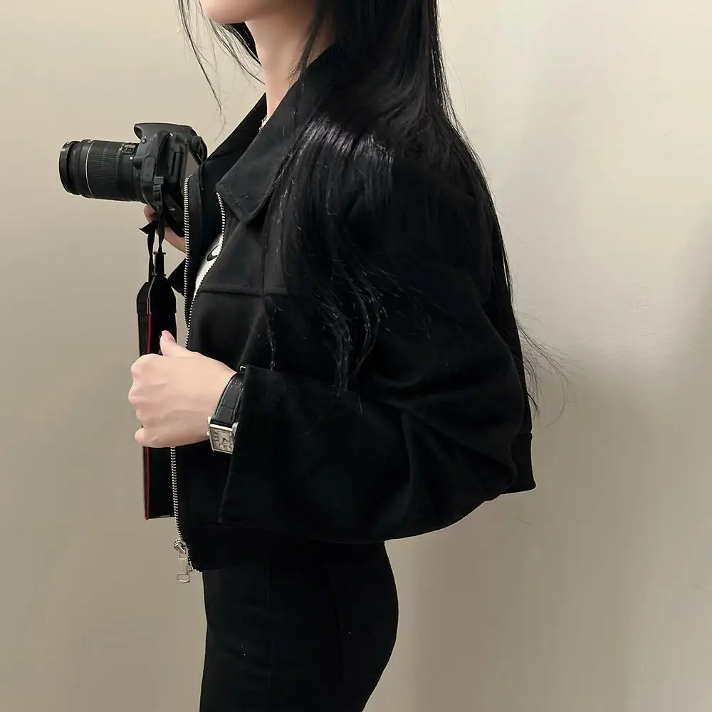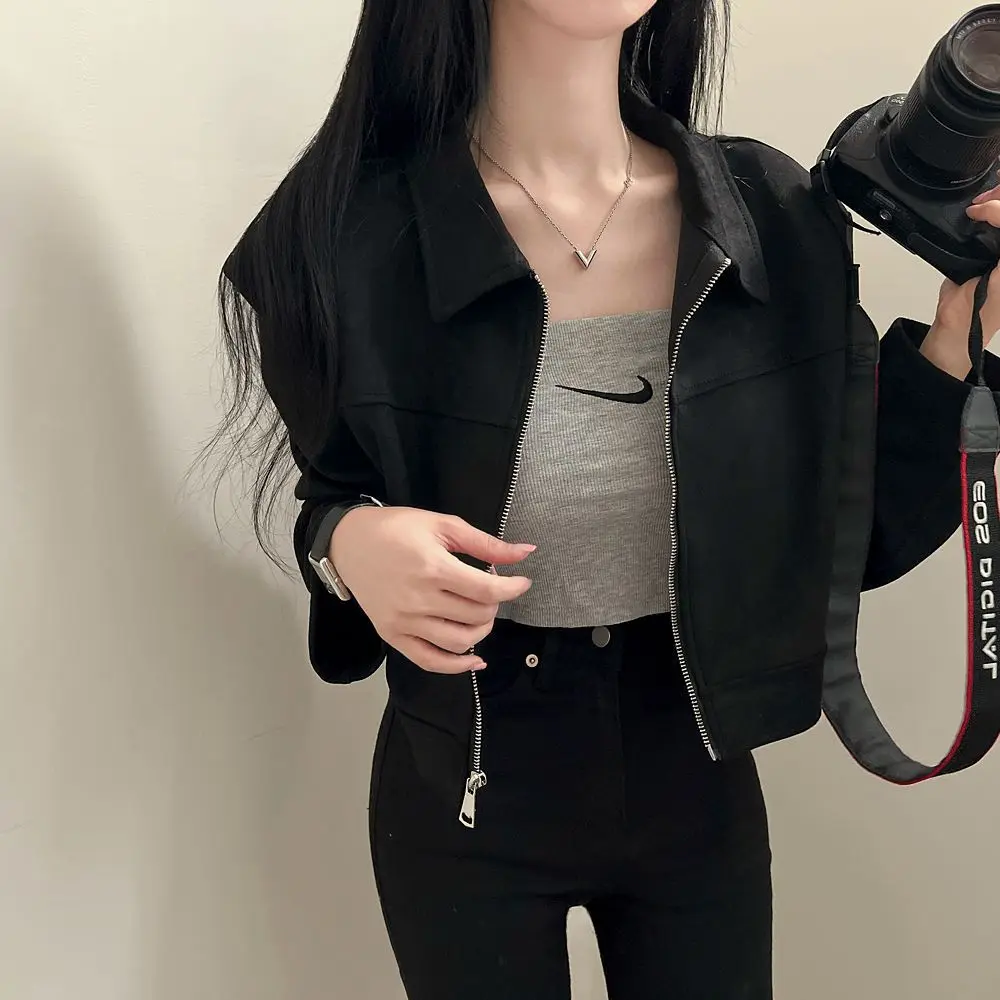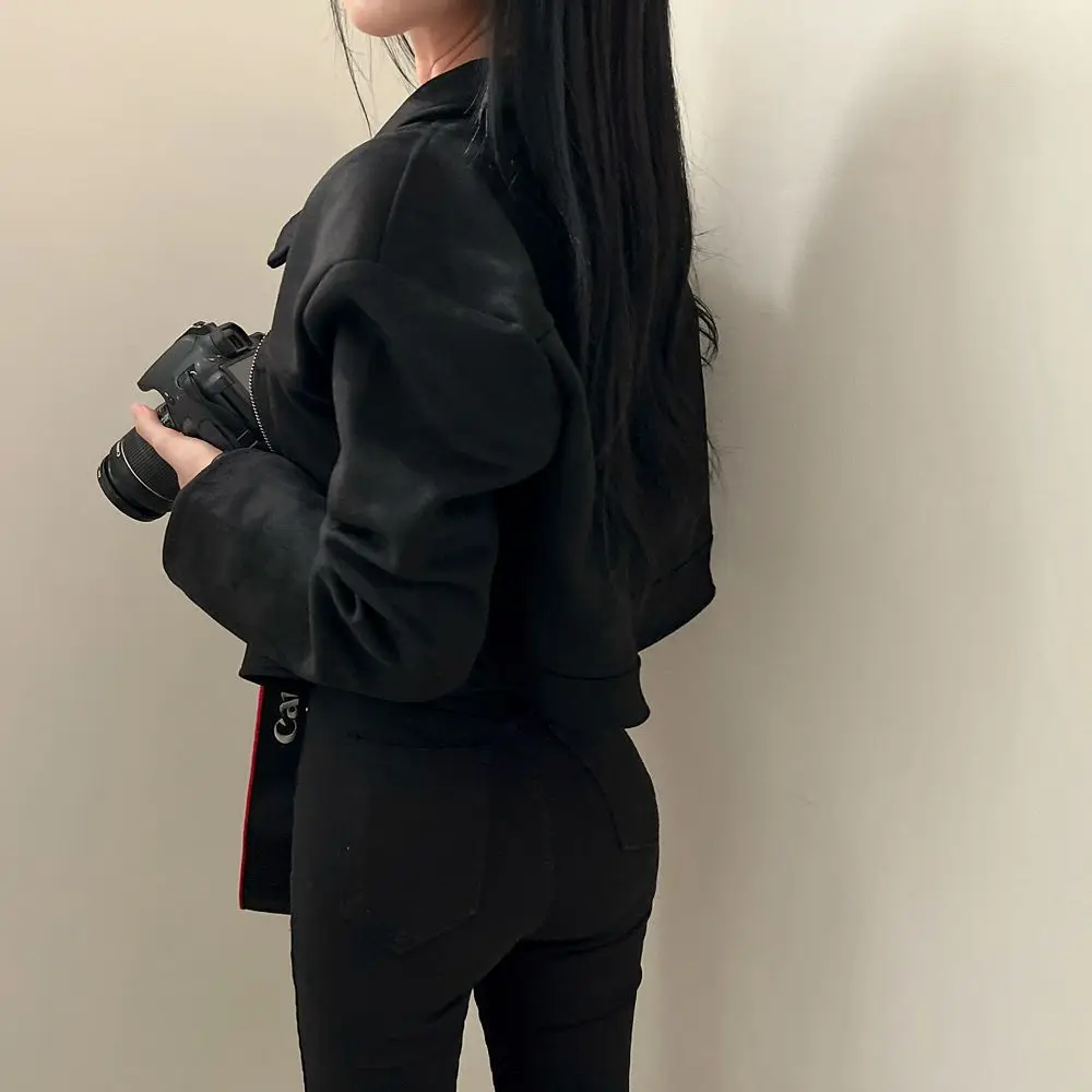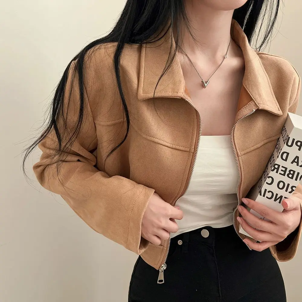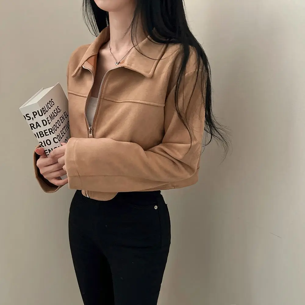 The short, sleek design of this jacket adds a modern touch to any outfit, making it a staple piece for the autumn season.