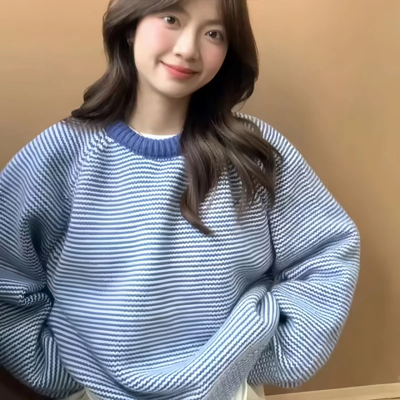 This blue sweater exudes a Korean lazy college style, perfect for those who want to blend comfort with trendiness.