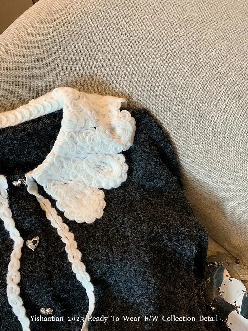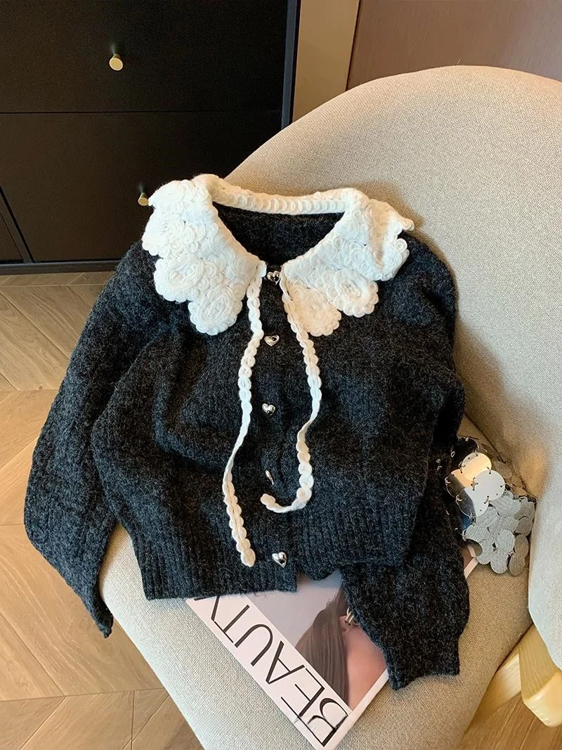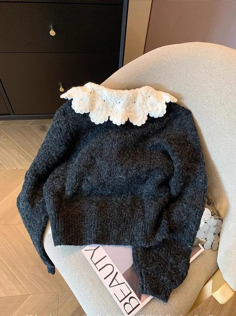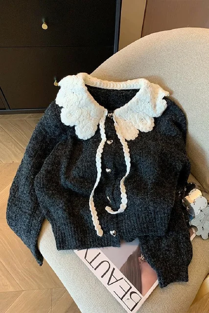 This sweater features a Korean style design, perfect for those who love a lazy chic look. Its doll collar adds a sweet touch to the overall aesthetic.