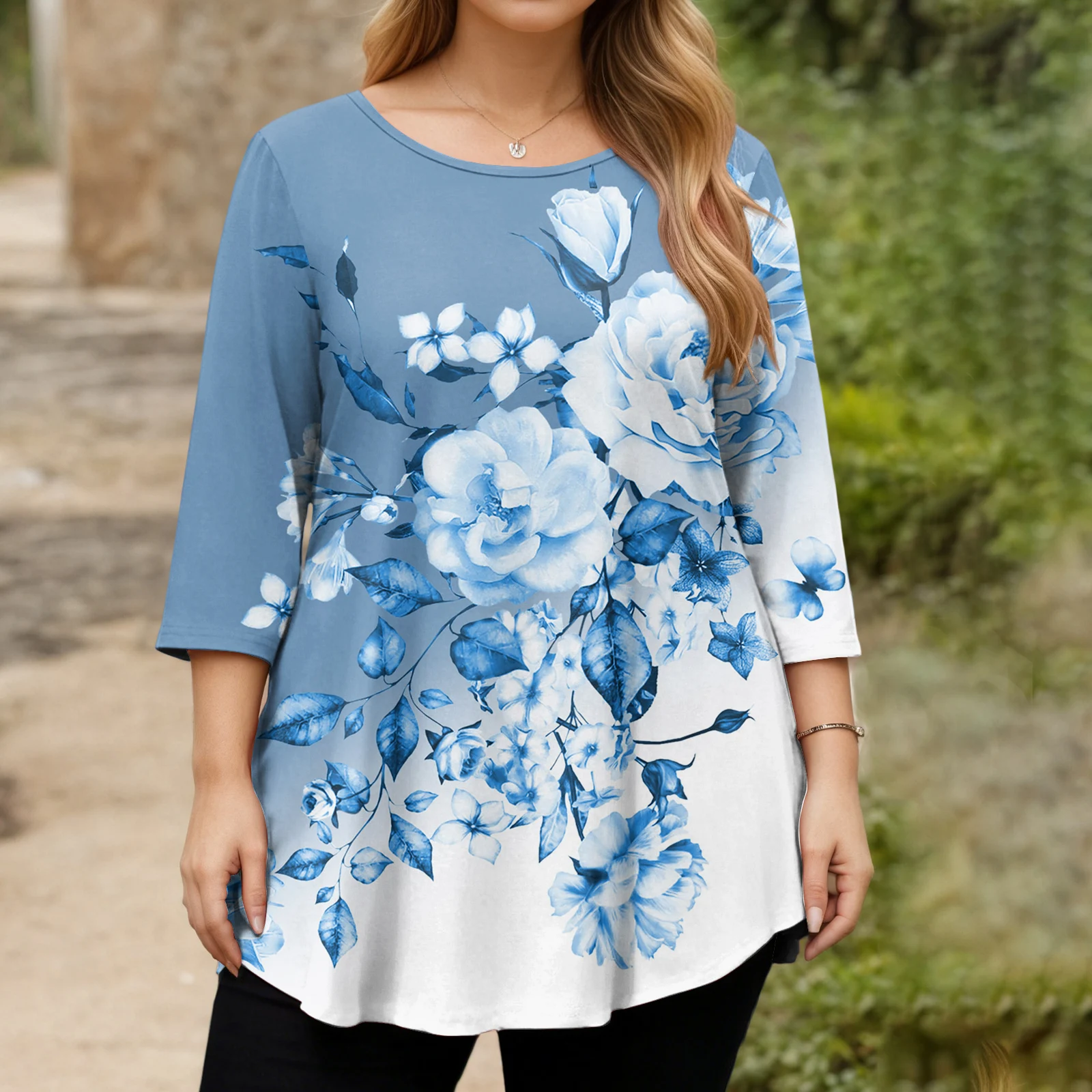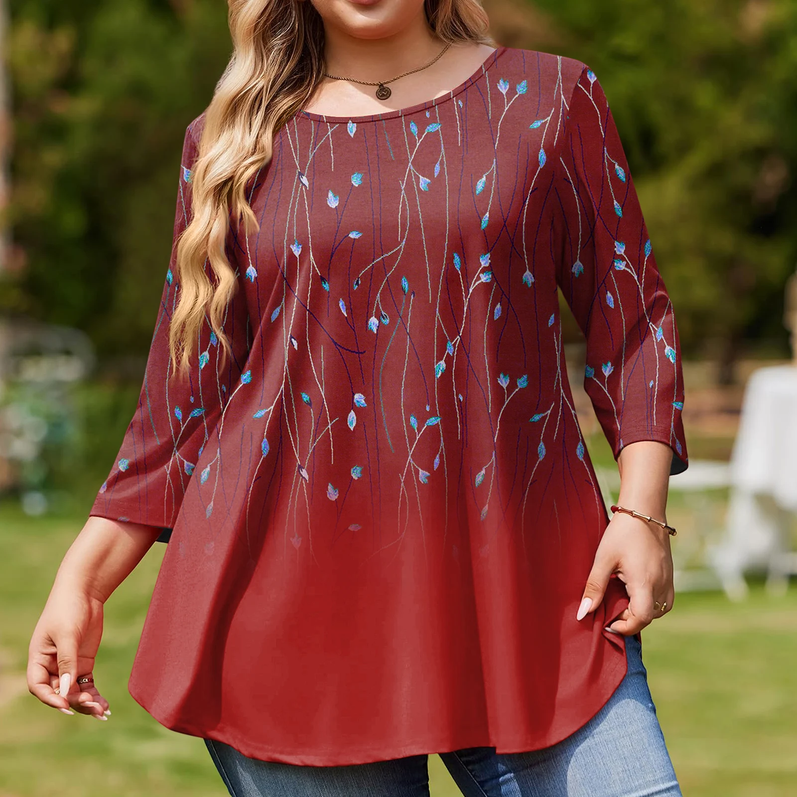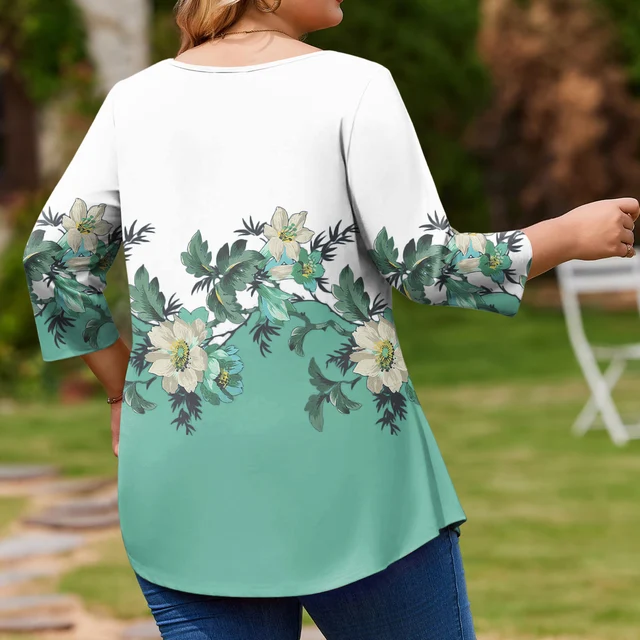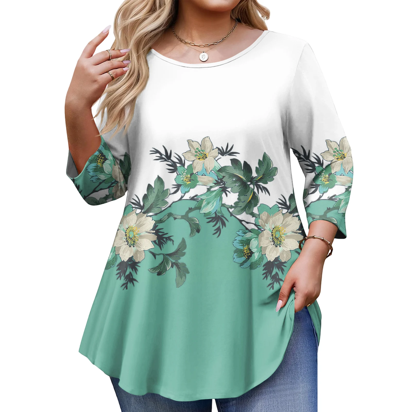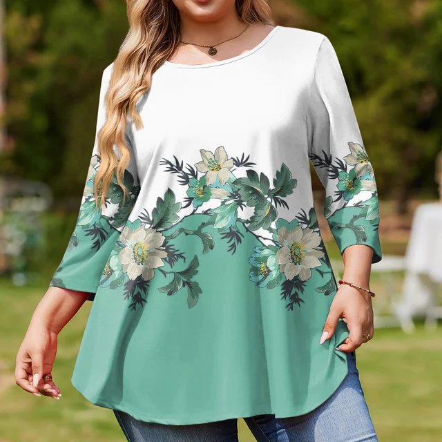 Ladies Floral Print Plus Size 3/4 Sleeve Round Hem Round Neck Fashion Top