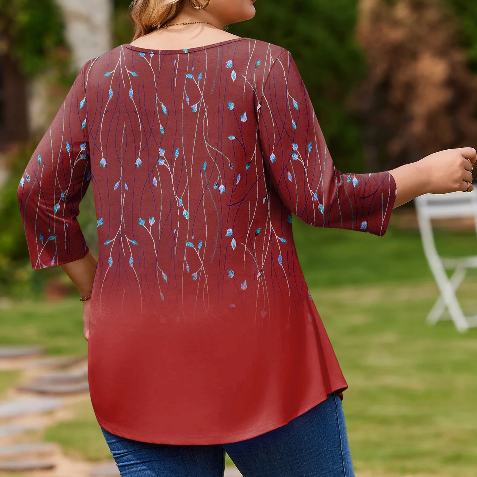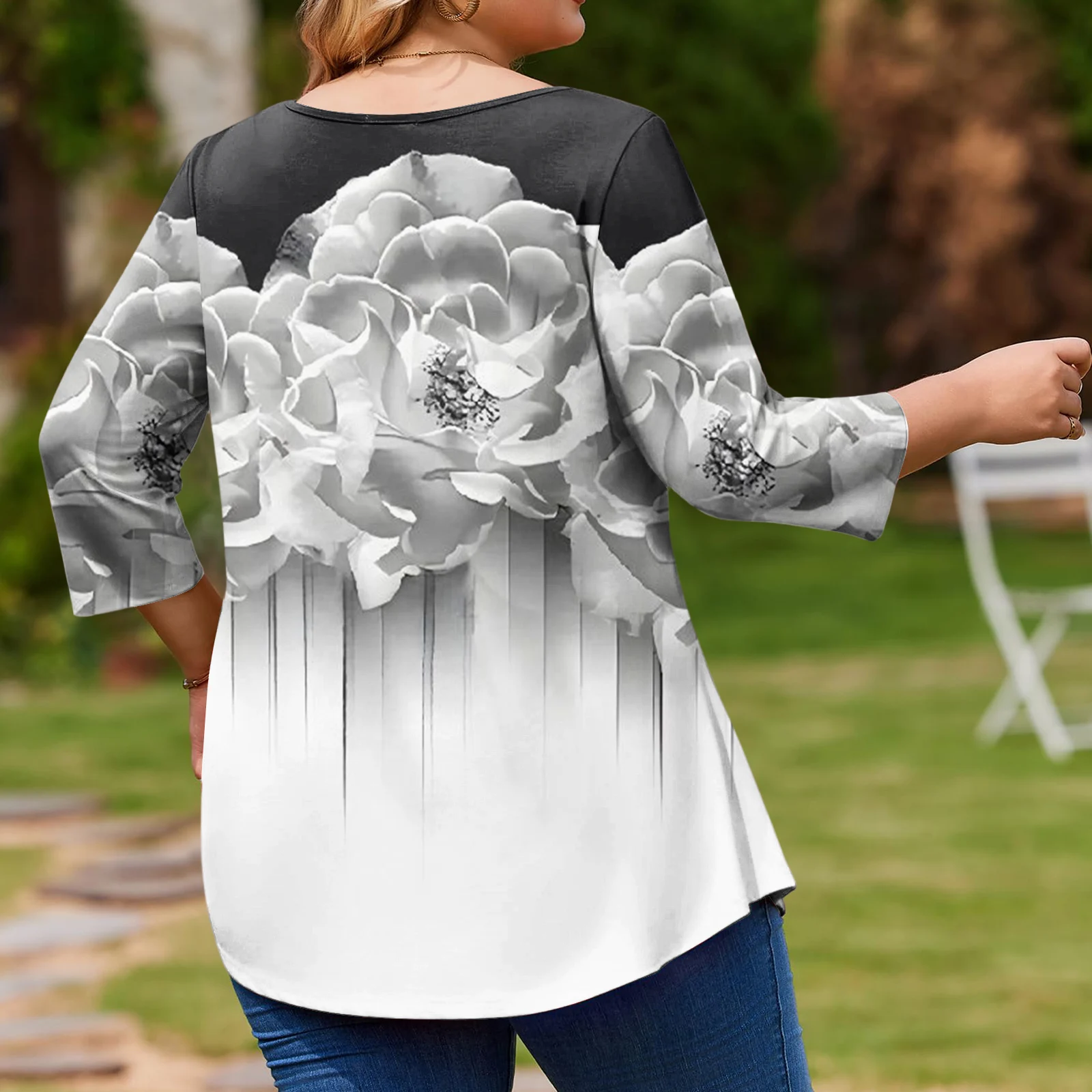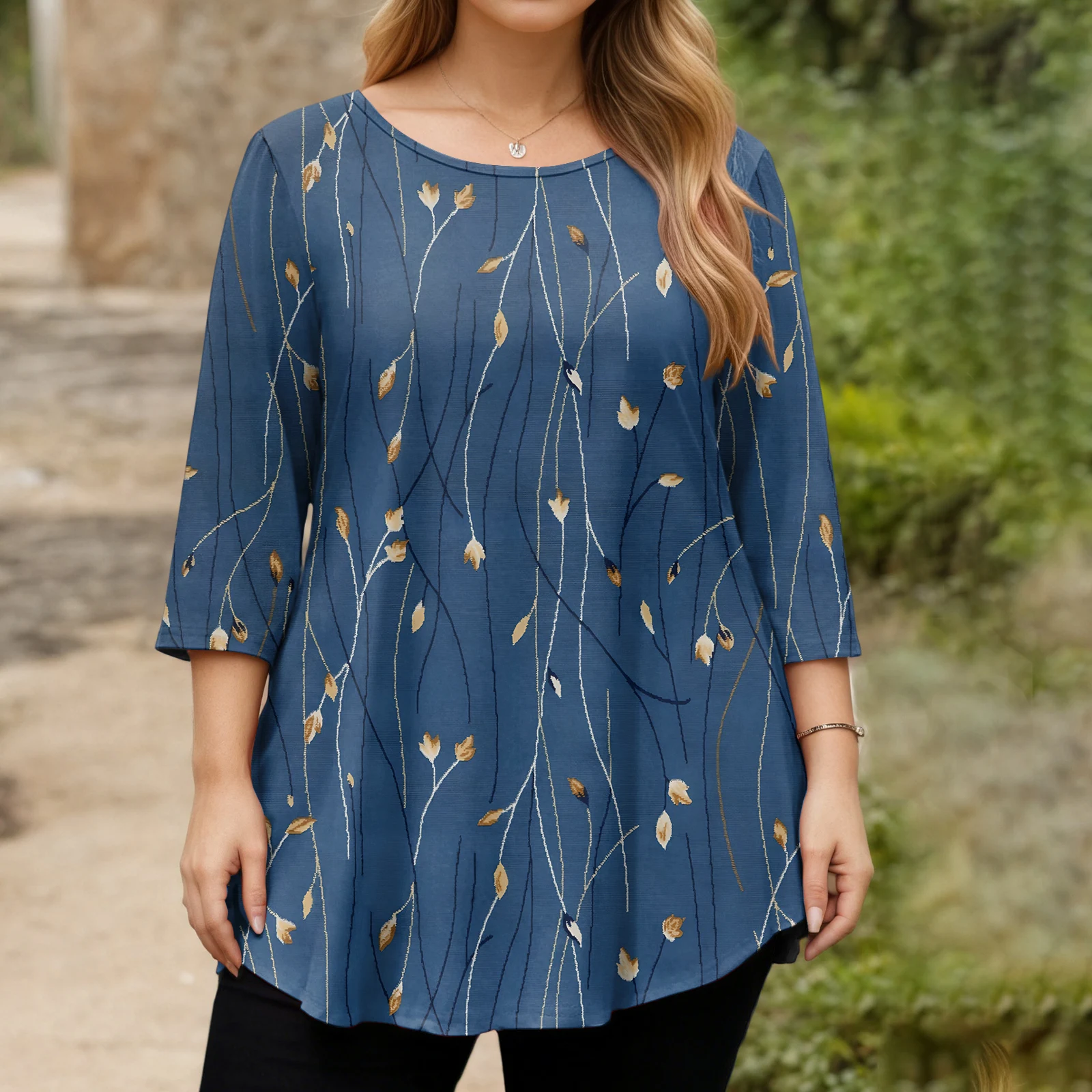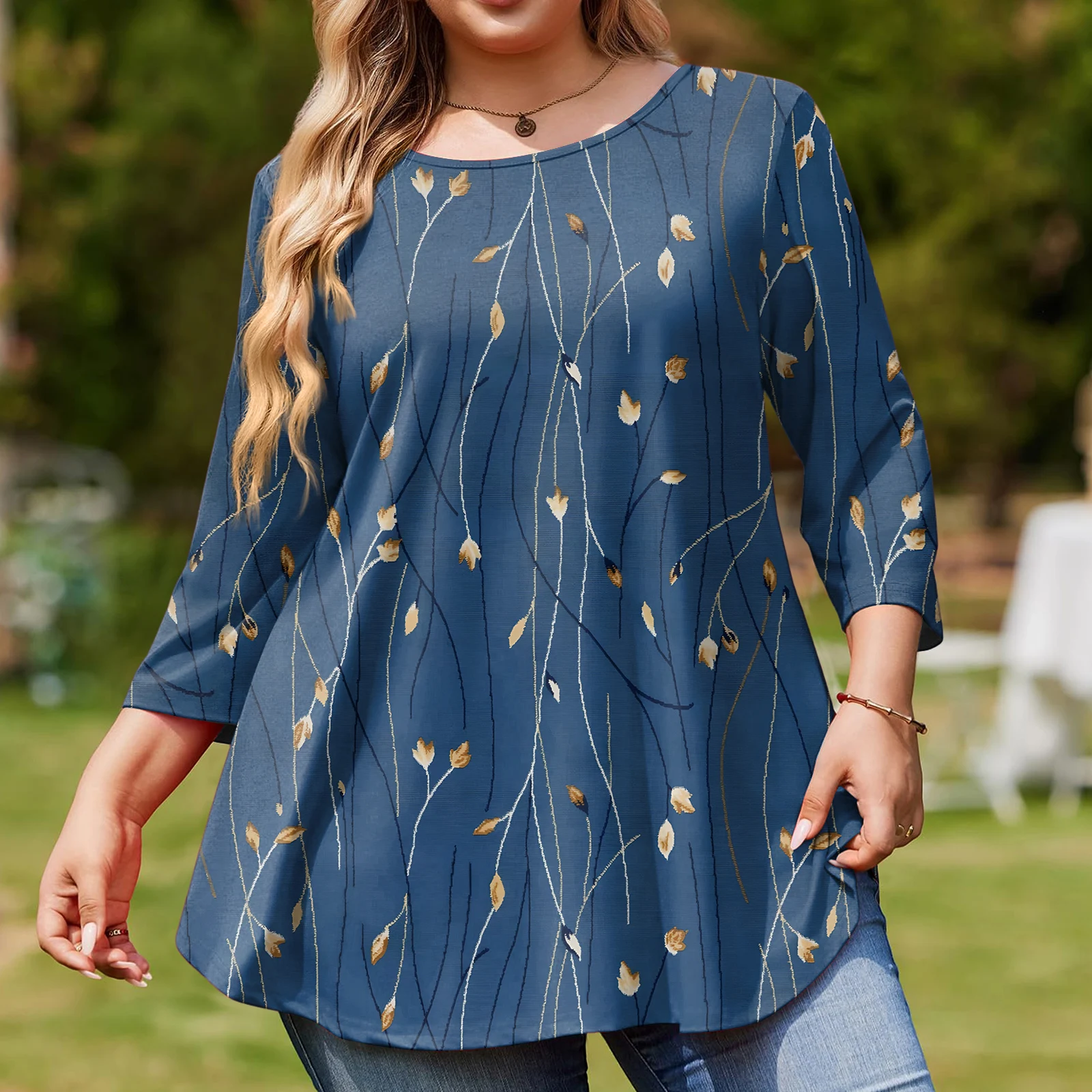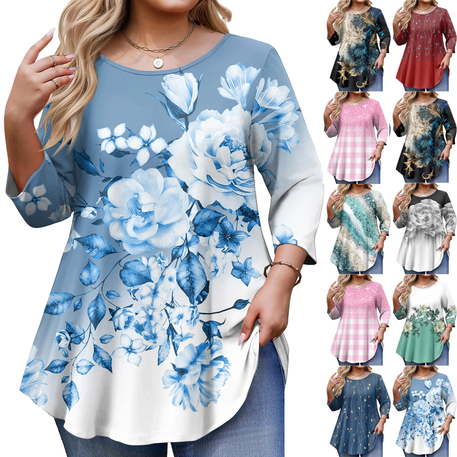 Ladies Floral Print Plus Size 3/4 Sleeve Round Hem Round Neck Fashion Top