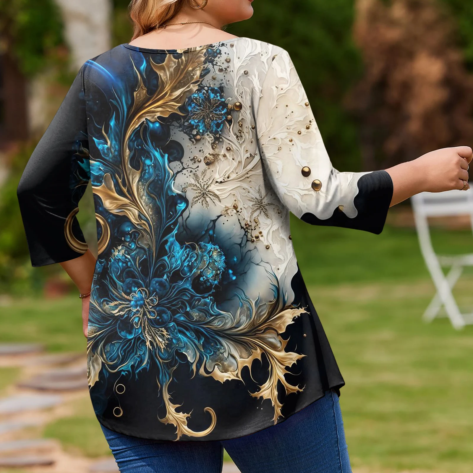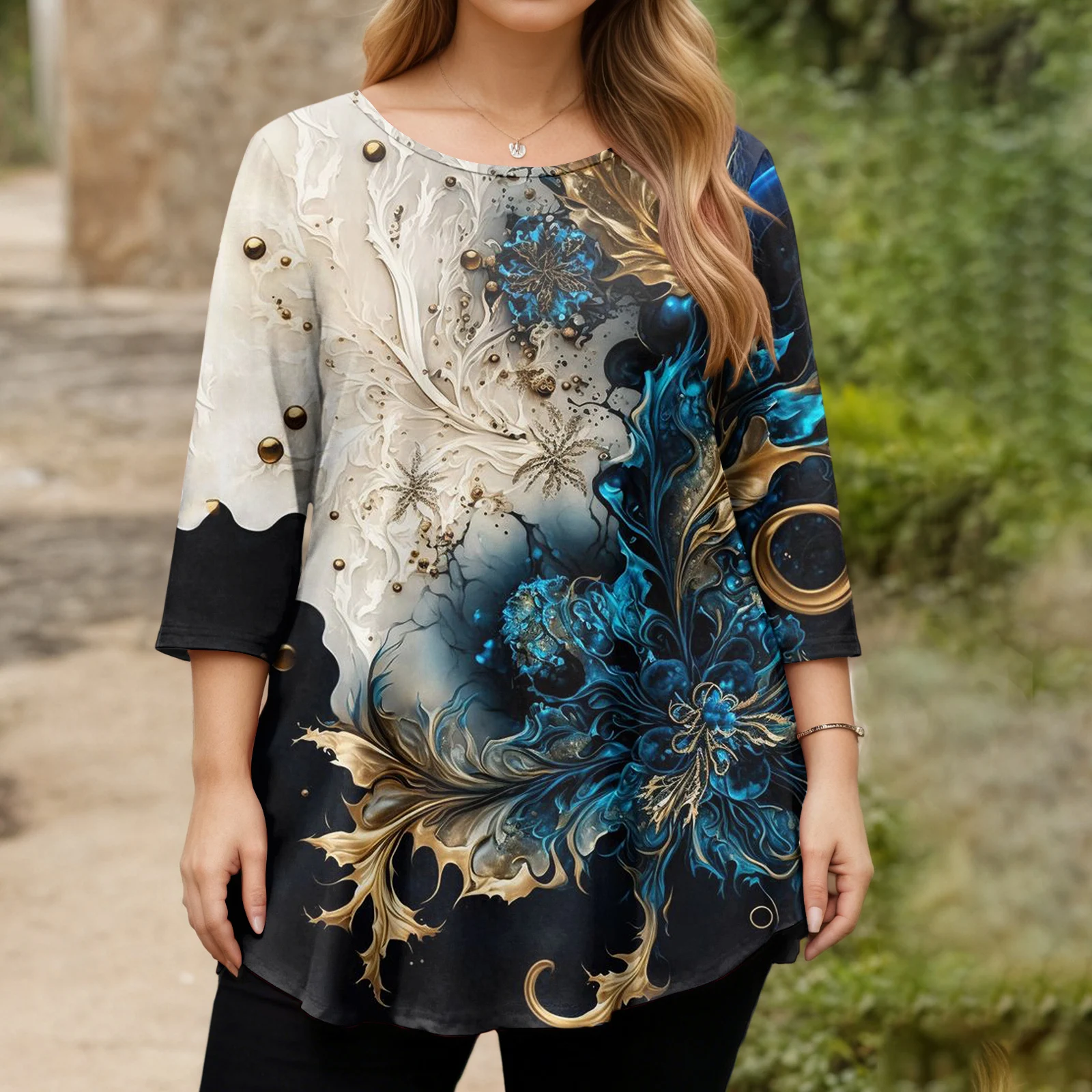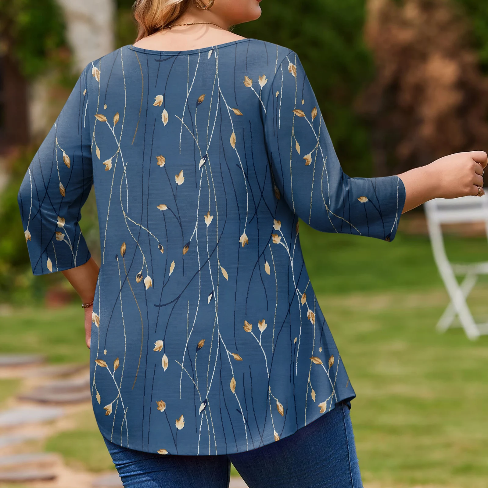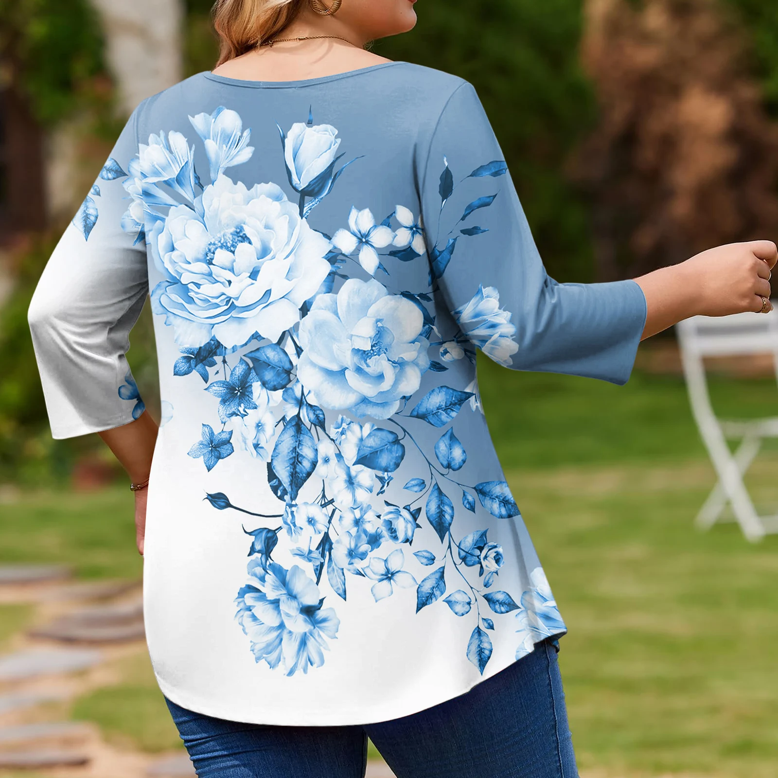 Ladies Floral Print Plus Size 3/4 Sleeve Round Hem Round Neck Fashion Top