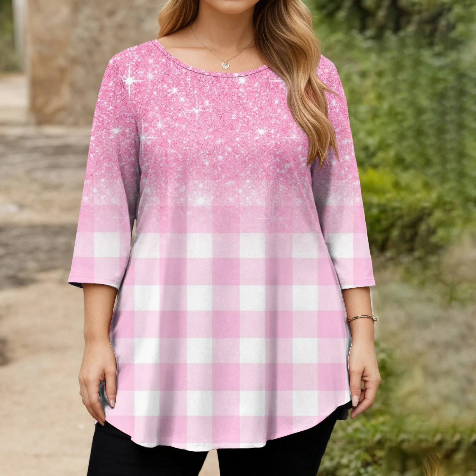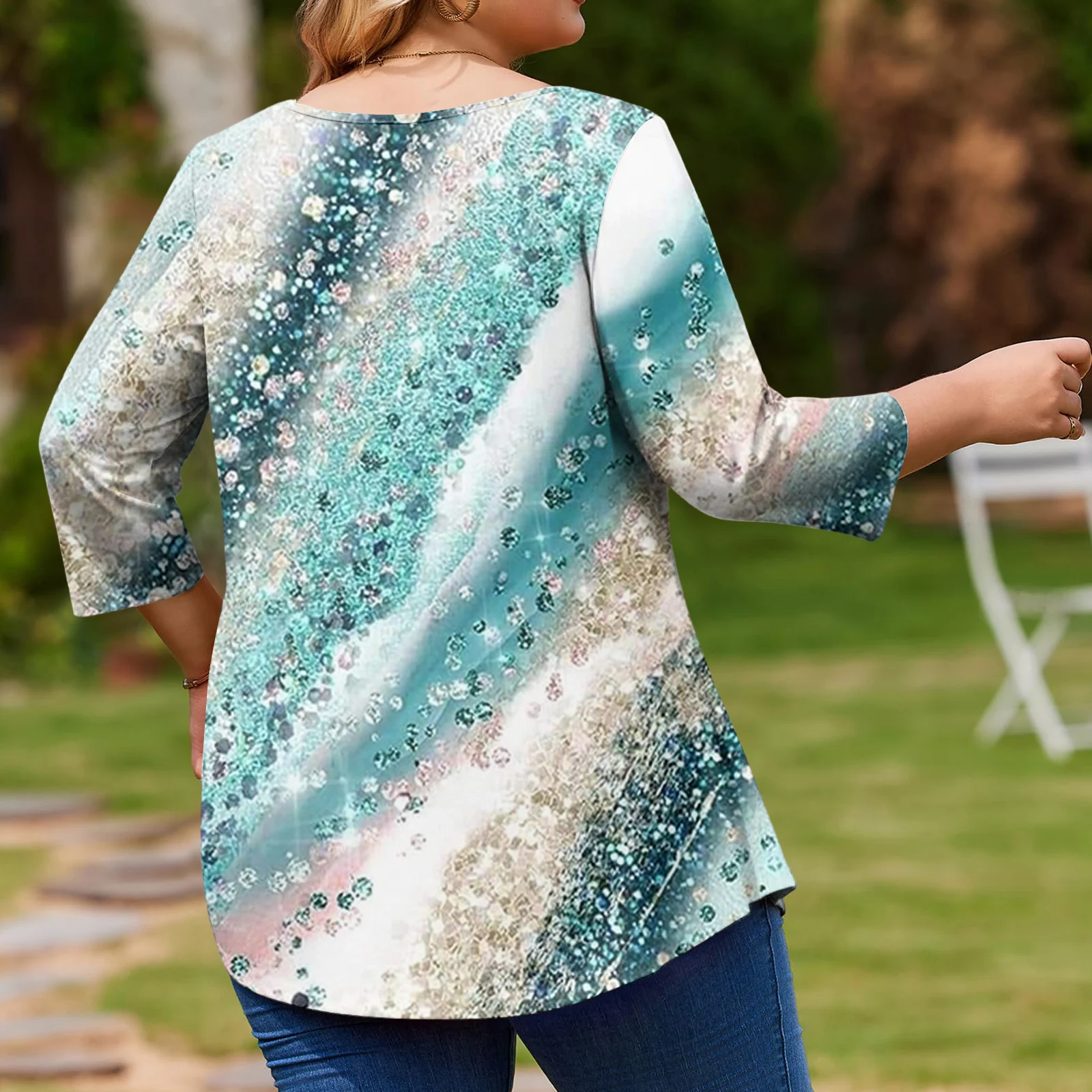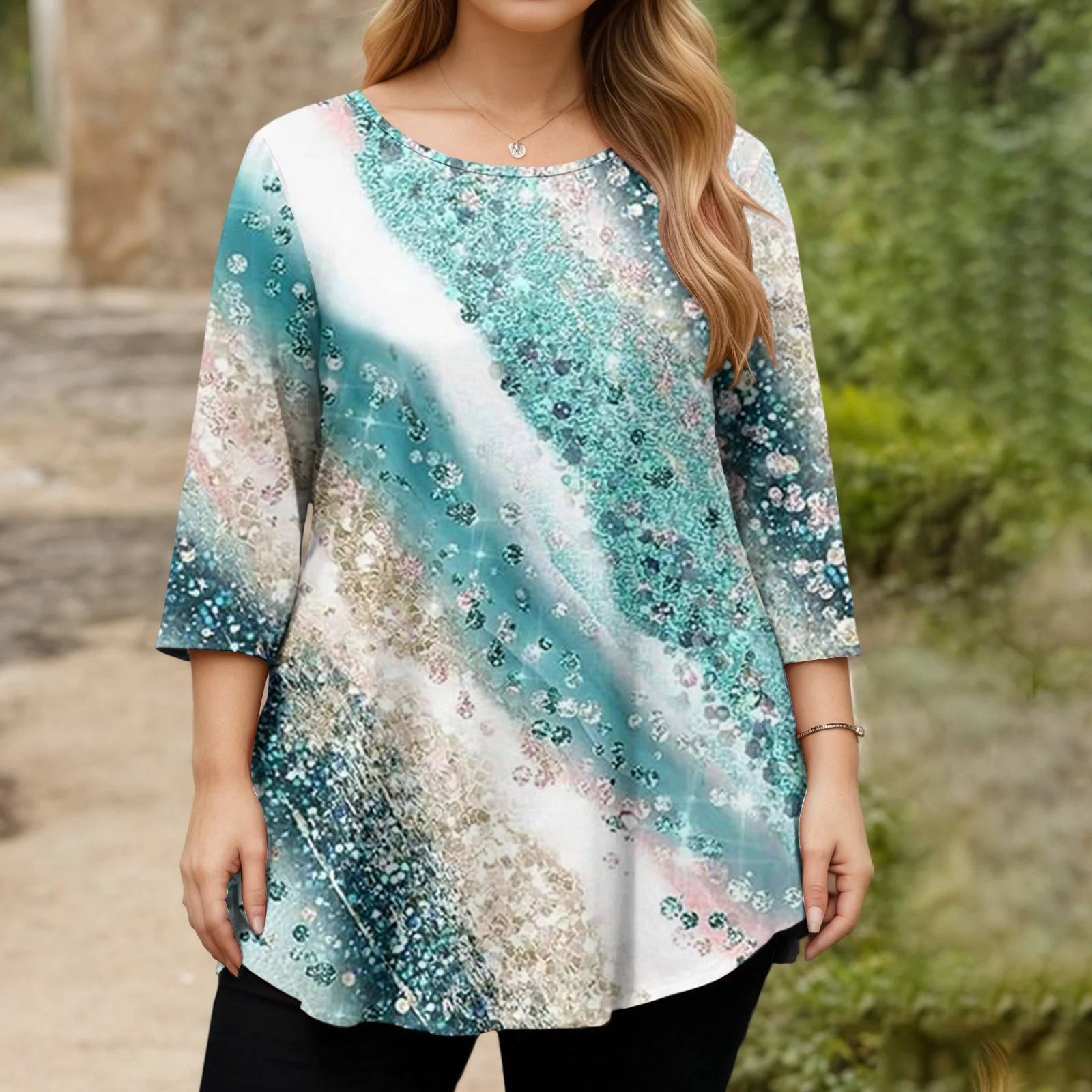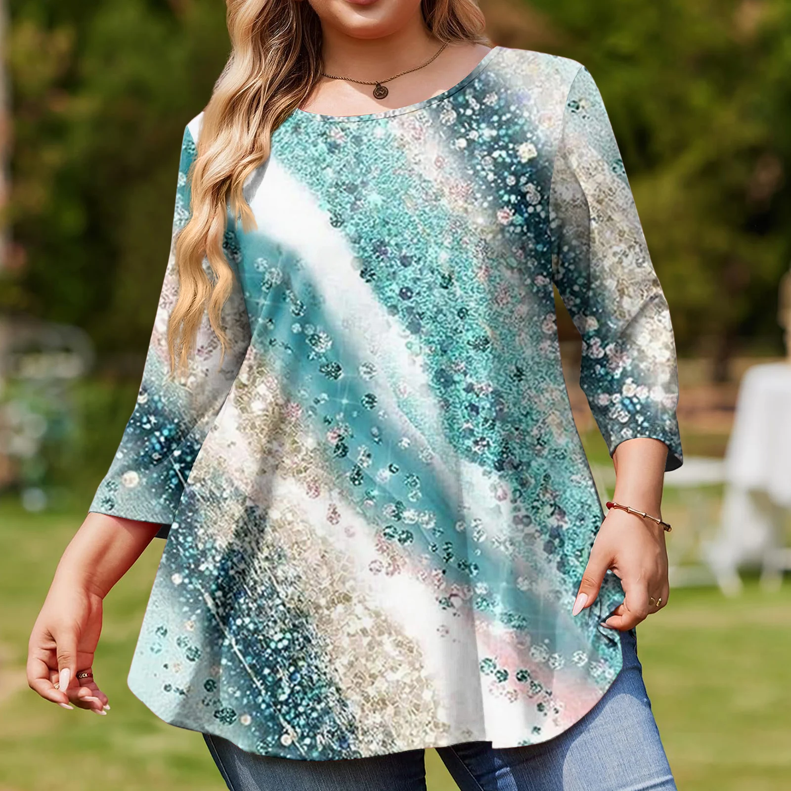 Ladies Floral Print Plus Size 3/4 Sleeve Round Hem Round Neck Fashion Top